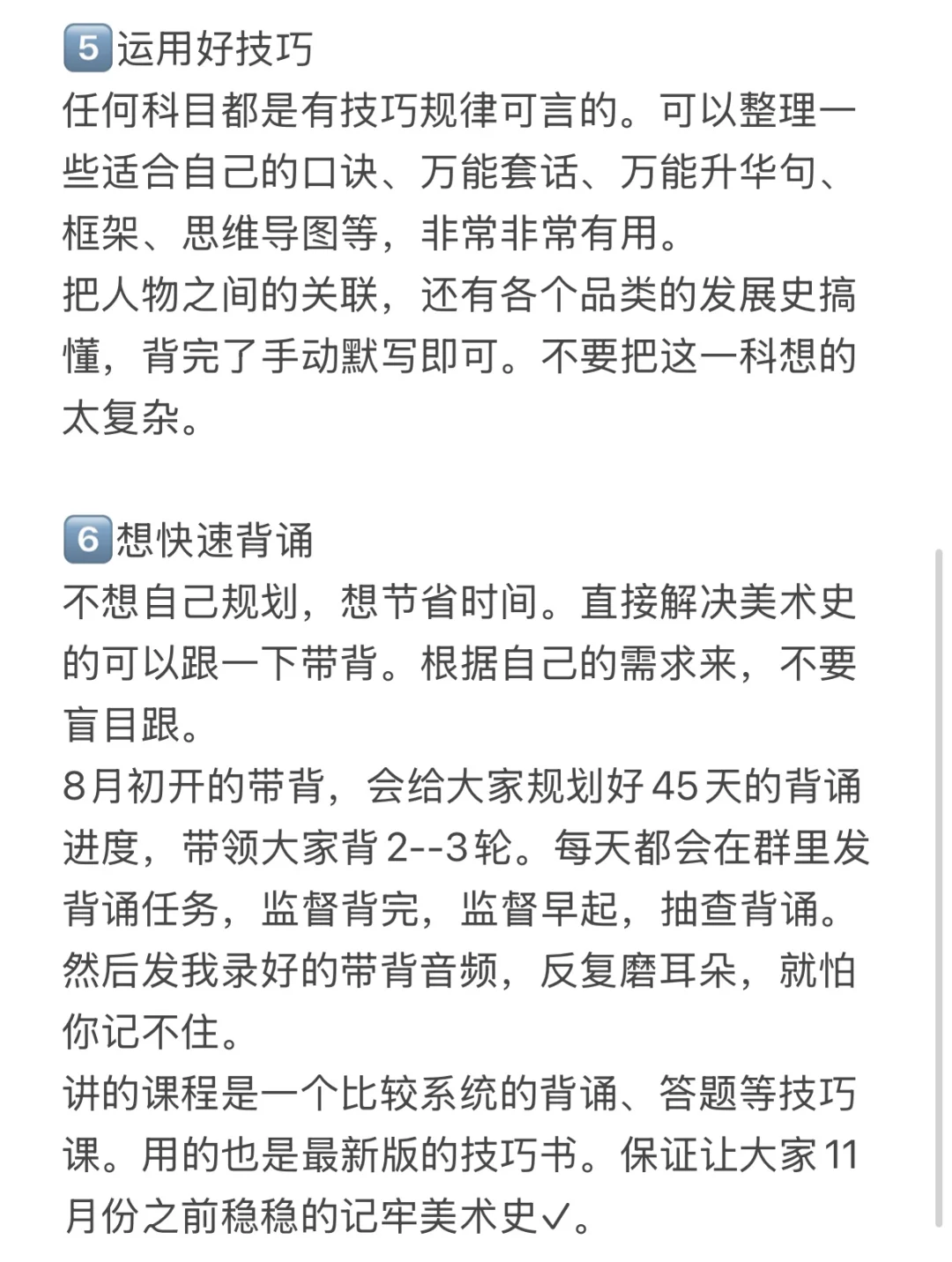 讲的课程是一个比较系统的背诵、答题等技巧课。用的也是最新版的技巧书。保证让大家11月份之前稳稳的记牢美术史✓。