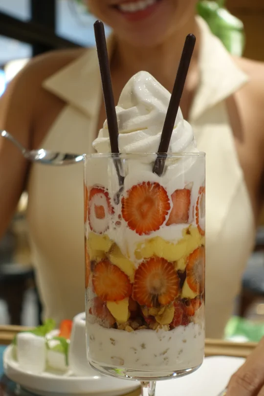 推门就被茑屋的静谧书香和咖啡香包围,瞬间降温5度🧊。直奔主题,当店员端上这碗芭菲时,我俩眼睛都亮了✨!这颜值,妥妥的日杂封面C位啊!