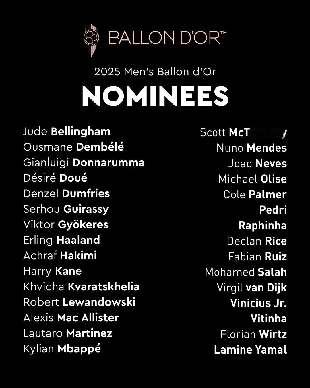 时代巨变!金球奖30人大名单首次没有C罗梅西! 2025年金球奖30名候选人名单公开,登贝莱、亚马尔等大热门在列,一个重大的变化是:没有了C罗梅西! 过去的20多年(从2003年起),梅西和C罗基本都在金球奖30人大名单,两人更是统治性地拿到了13座金球奖! C罗梅西双双落选金球奖30人大名单,过去20多年来还是第一次,说明梅罗时代彻底结束了! 当然,如果C罗和梅西在明年的世界杯有突出表现,再回金球奖大名单乃至获奖也不是不可能! 金球奖大名单