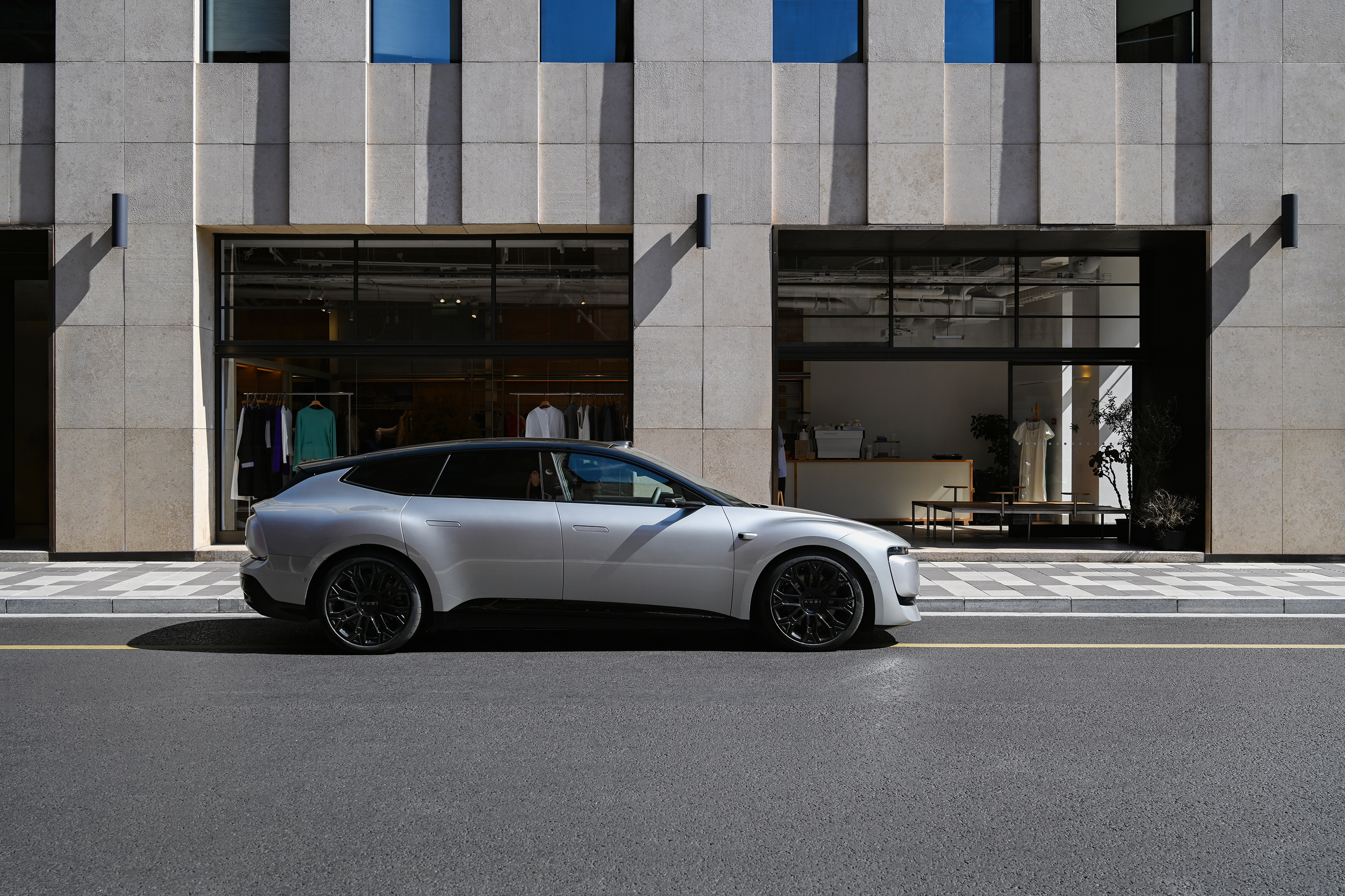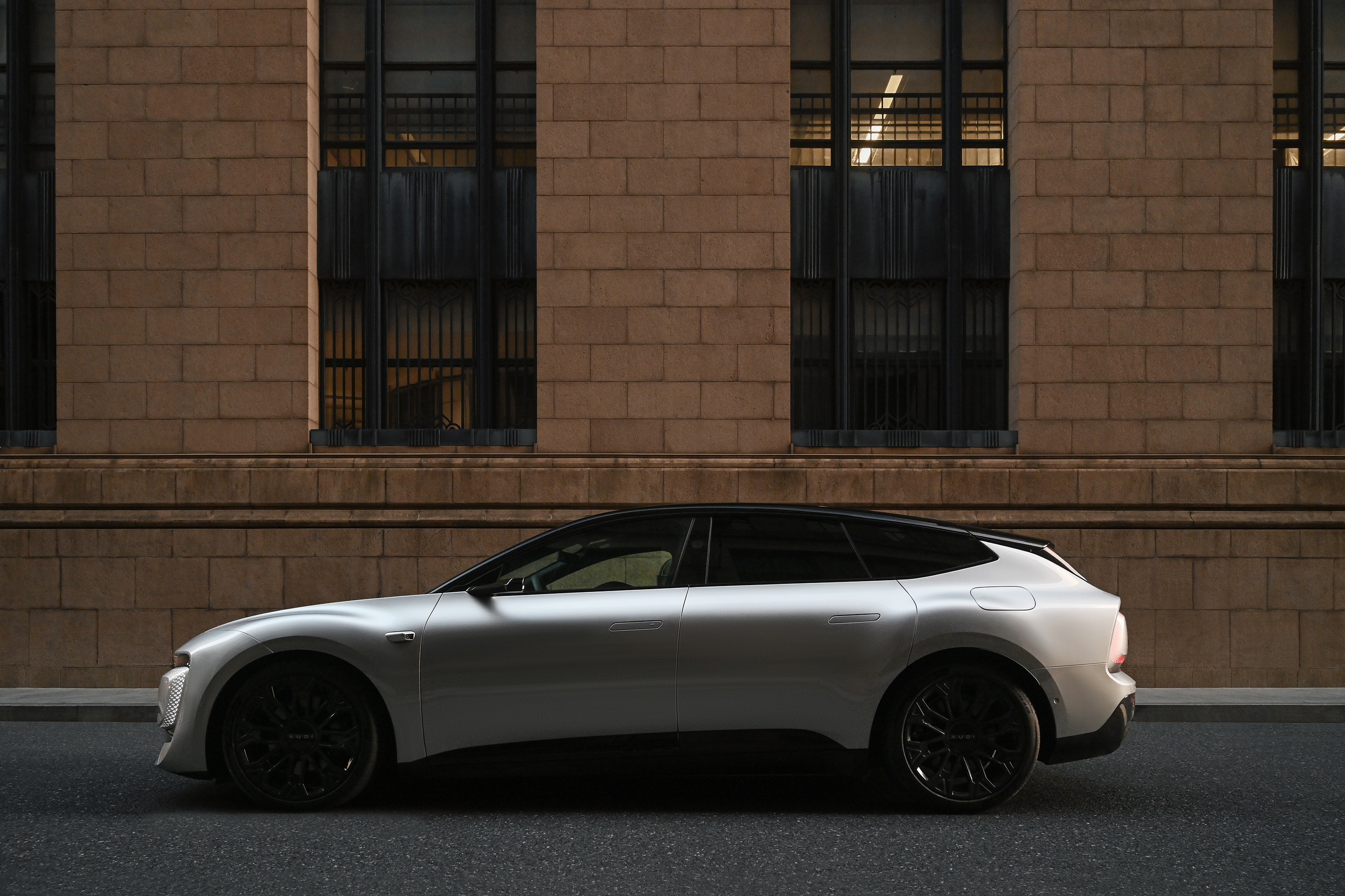 一条流线型黑色环带从前脸延伸至车尾,在晨光中勾勒出立体而富有力量感的曲面,与摩天大楼的刚毅直线形成了美妙的对比与互补。在它极简主义的立面旁又展现出另一种魅力——每一处曲面转折都经过精心计算,每一个棱线都干净利落,悄然化身为与建筑艺术共鸣的流动雕塑。
