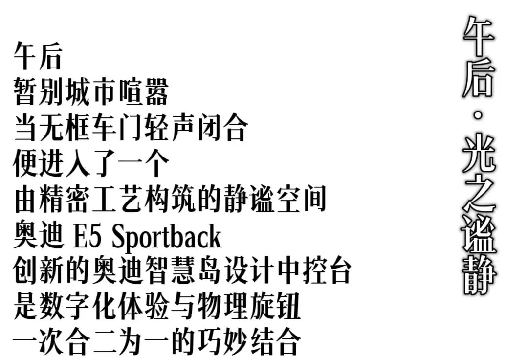 奥迪 E5 Sportback这位朋友,让我看到了未来生活的美好模样——科技与人文不是对立面,而是相辅相成的双生花;理性与感性不再割裂,而是完美融合的生活智慧。真正的未来感,不在于多么炫酷的技术,而在于这些技术如何服务于人的情感需求,如何让生活变得更加优雅从容。