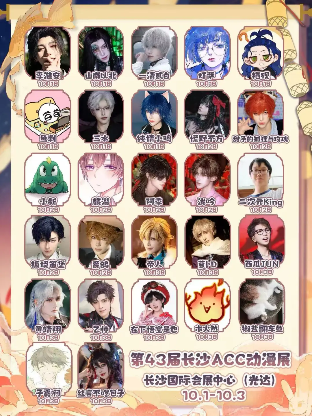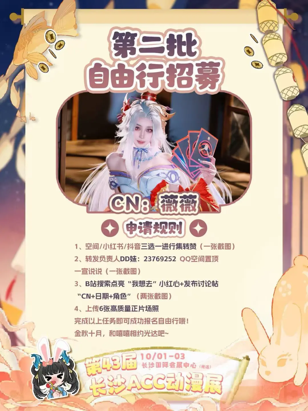 我是陈陈,我申请长沙ACC漫展Cos自由行 首发嘉宾: 【10.1】山南以北、一清贰白、灯萨、栖砚、鱼刺、李淮安、三水、纯情小鸡 【10.2】麟潜、泷吟、阿季、板烧笛堡、甜子的狐狸与玫瑰、二次元King、小新、慌野不方 【10.3】在下悟空是也、黄靖翔、乙帅、萝卜D、帝人、西瓜JUN、子雾啊、丝言不吃包子、木火然、椒盐翻车鱼 地点:长沙国际会展中心(光达) 举办时间 : 2025年10月1日-10月3日 申请时间:10月1号2号3号 申请角色:清凝、明日香、结束祁
