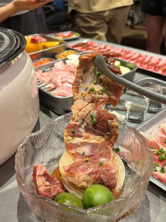 厚切的横膈膜吸足了青梅汁的酸甜,烤到边缘微焦,咬下去肉汁混着果香爆开,清爽不腻!