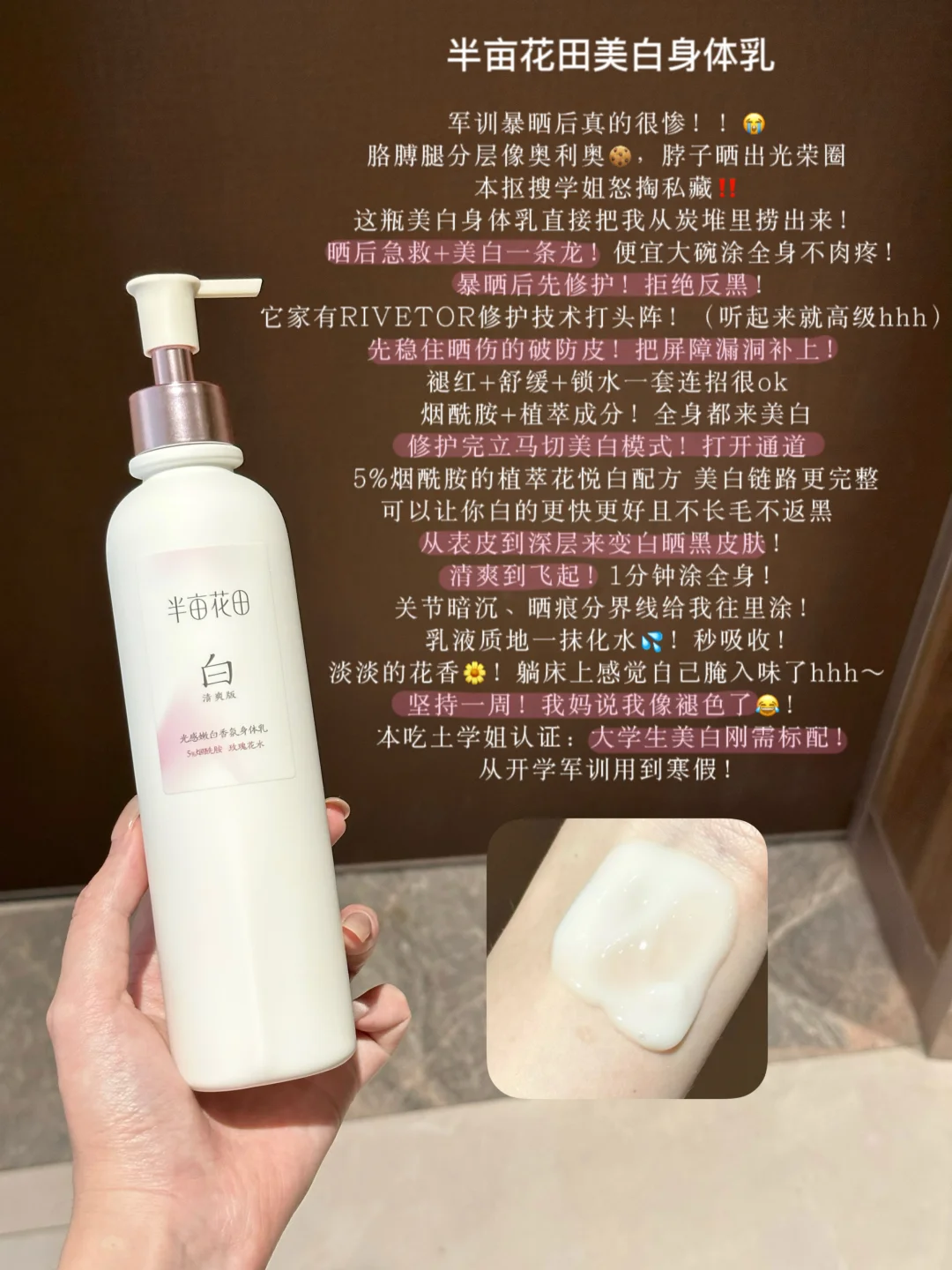 半亩花田美白身体乳:军训暴晒🥷没有它白不回来的人 凡士林粉啵啵:关节膝盖也要白白白 Olay超白瓶:水光白嫩,夏天也能坚持用 妮维雅果酸身体乳:皮肤粗糙暗黄有救了 身体乳身体乳推荐美白身体乳美白身体乳推荐晒后修护晒后美白浴室好物半亩花田身体乳半亩花田美白身体乳半亩花田军训美白美白身体乳夏天美白身体乳排行榜全身美白