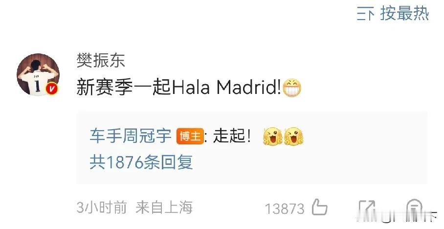 今晚的热搜被他俩霸屏了! 又是合影,又是互关的, 周冠宇晒和樊振东合影,樊振东在评论回复:新赛季一起Hala Madrid! (皇马冲啊) 周冠宇说:走起! 并且两人还互相点了关注了! 这是什么神仙梦幻联动! 同为体育界的顶尖高手, 一个是在F1赛道风驰电掣, 一个是在乒乓球桌大杀四方, 还记得, 两人在微博之夜相识的吧, 感觉当时两人就相见恨晚的感觉, 聊了很久, 这次互关真的狠狠满足粉丝的好奇心了!