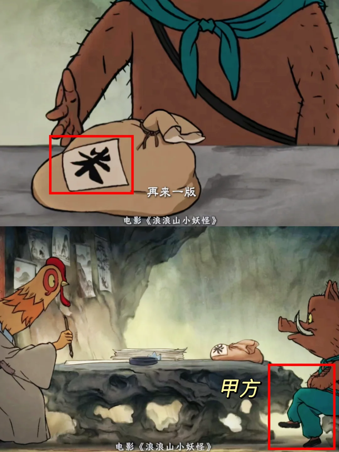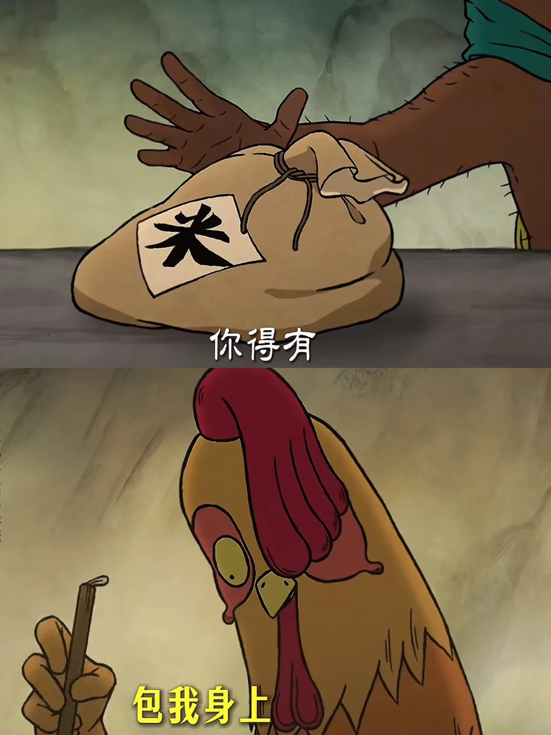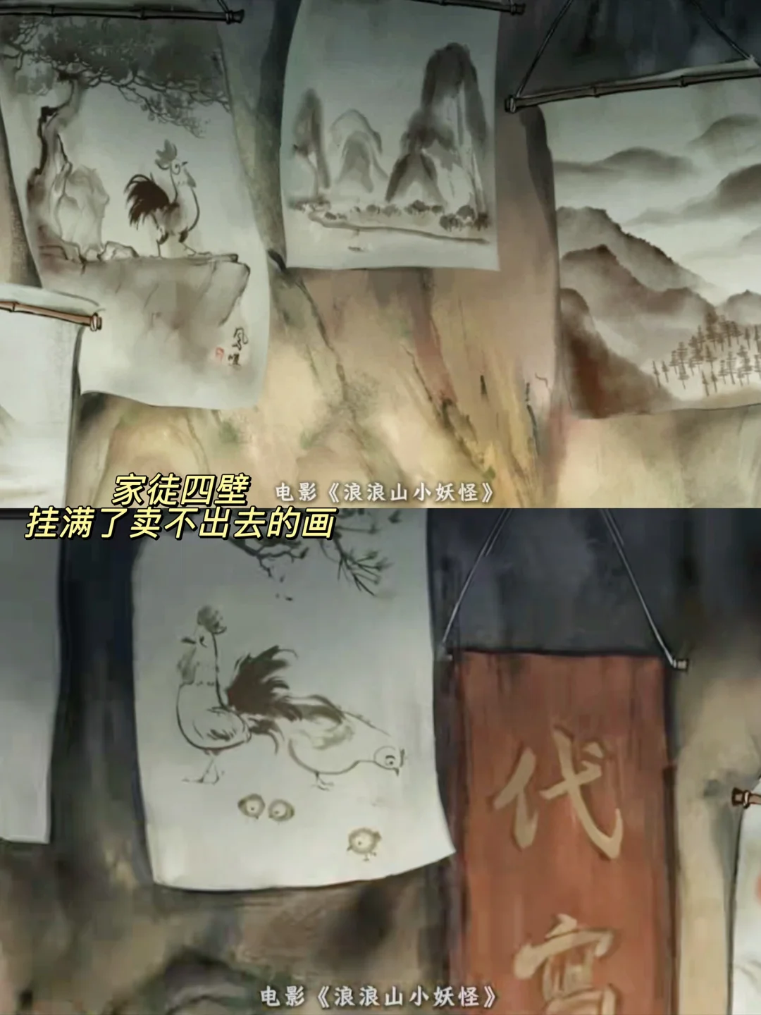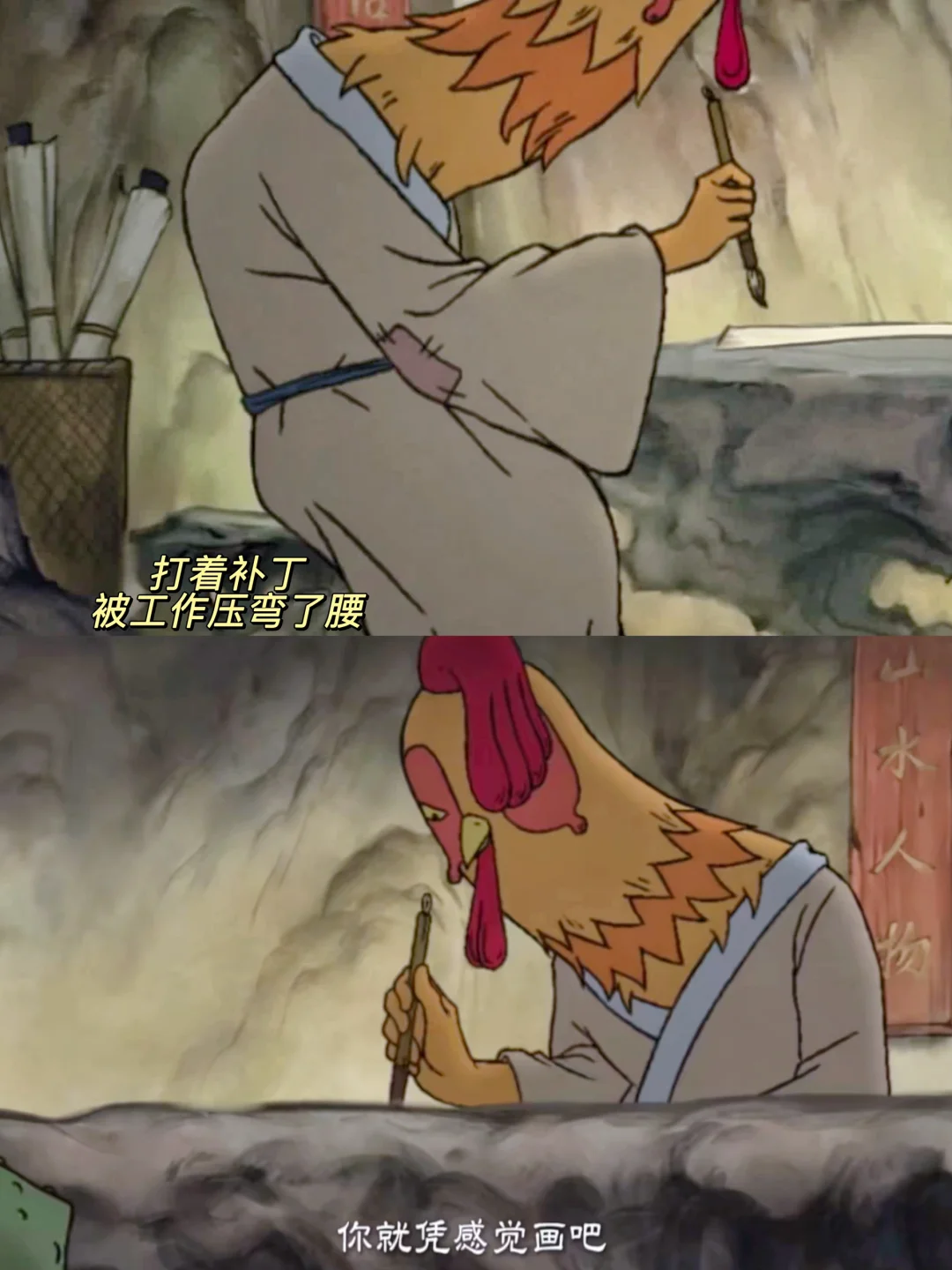 从生活压力上看,鸡画师过得并不如意。衣服是打补丁的,墙上挂满了卖不出去的画,累到模糊的时候,小猪妖加米,他还是坚持画新的一版,“为五斗米折腰”具象化了。