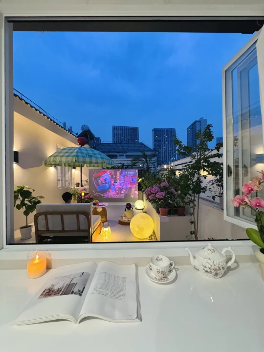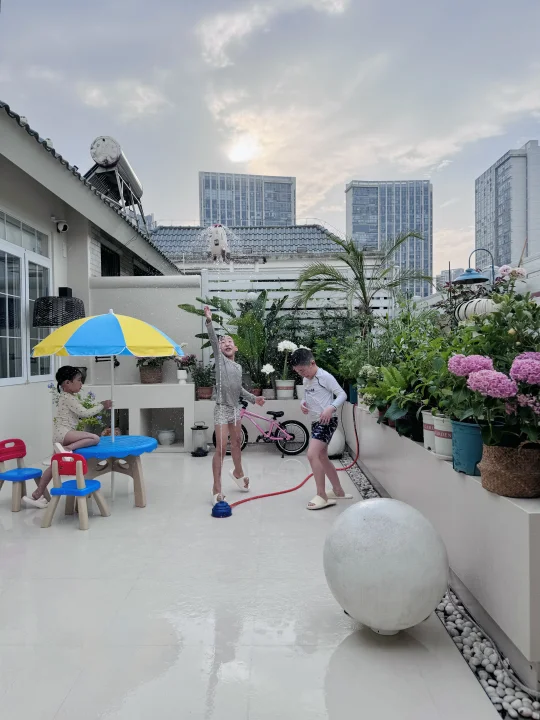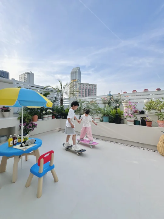 不管是院子或露台都建议做硬化,因为蚊虫真的会少很多,局部点缀几个花池种植物就完全足够了!露台用了白色石户外英砖搭配同色美缝