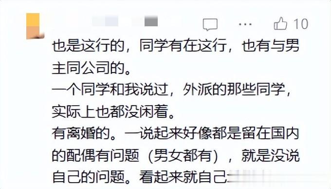 更有内行人透露:这种外派的同学,绝大多数其实在外面也没闲着。你别看那些离婚的一说起来,自己都是受害者,是留在国内的配偶有问题,自己是受害者;事实上,多半自己也玩的花着呢[笑哭]
