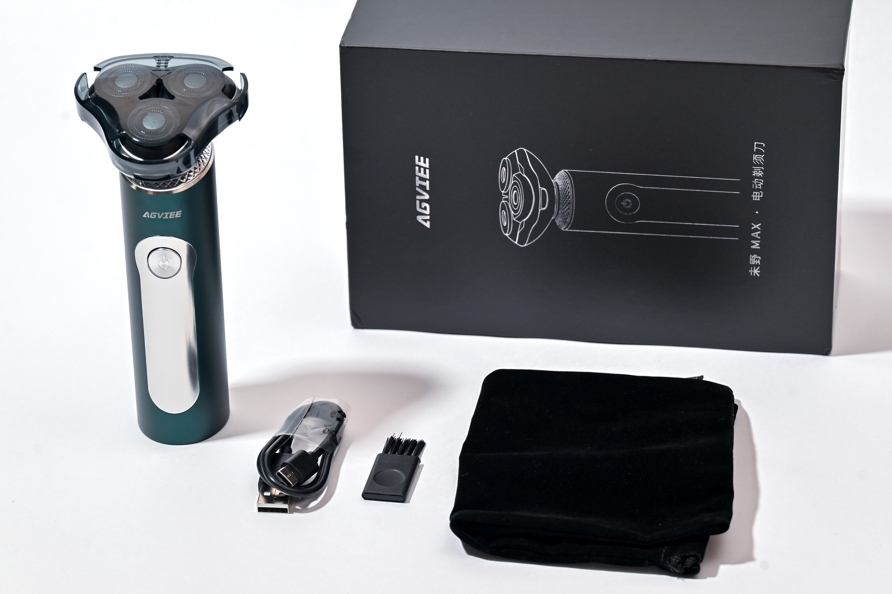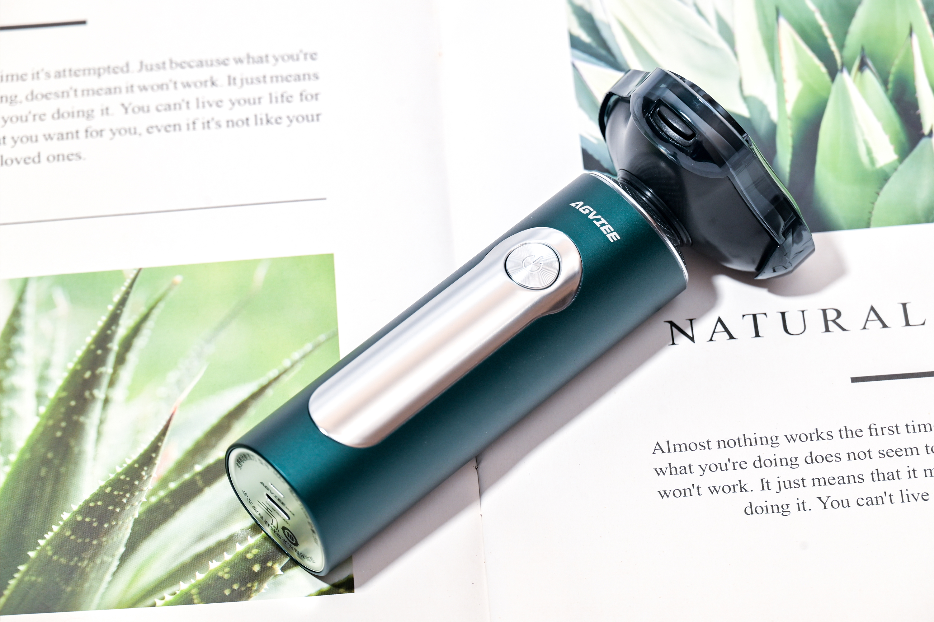 剃须刀设计极为简约,仅在机身前部印有未野的英文品牌标识“AGVIEE”,中心位置设有一颗开关机按键。然而,在极简之下隐藏着惊喜:开机后,正面的LED指示灯会亮起,清晰显示当前剩余电量。