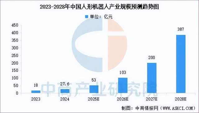 但这似乎并不影响人形机器人的整体市场走向,中商产业研究院发布的《2025—2030年中国人形机器人行业分析及发展前景研究预测报告》显示,2024中国人形机器人产业规模约27.6亿元,较上年增长53.33%,预测2025年中国人形机器人产业规模将达到53亿元,2028年达到387亿元。