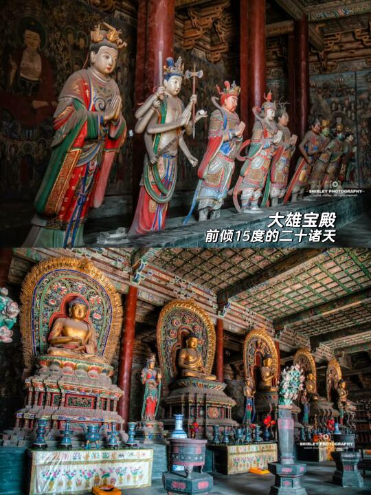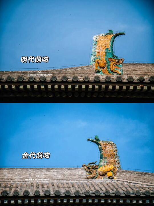 2️⃣上寺的大雄宝殿:体量庞大的金代遗构,4.5米的琉璃鸱吻为全国之最,其中北面的鸱吻是金代遗物,南面为明代增补。殿内二十诸天身姿前倾15度以示虔诚,很有特色