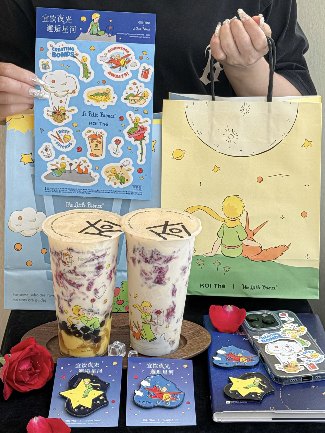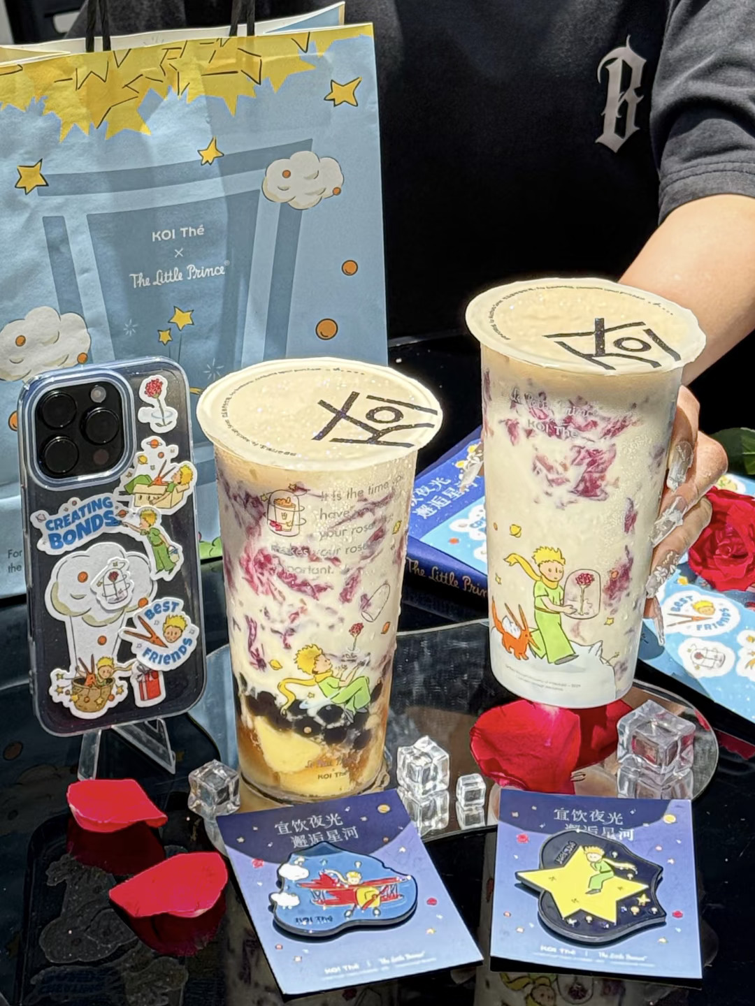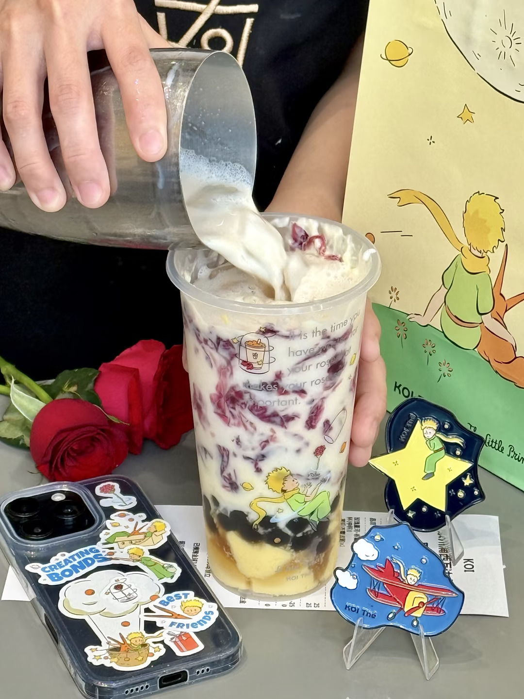 是真的!!koi和小王子联动! 有小王子联名冰箱贴、贴纸、主题杯和双杯袋….都好可爱啊!!! · ✔玫瑰星河·布蕾金乌龙+少冰+不另外加糖 一口就沦陷了。。玫瑰花挂壁真的好好看!味道十分香浓!搭配冻顶乌龙,好像在喝液体版云南鲜花饼!!还能嚼到超多布蕾和波霸!口感层次爆炸丰富😋 ✔玫瑰星河·乳酪金乌龙+少冰+微糖 不开玩笑,感觉是俺喝过最好喝的玫瑰奶茶!玫瑰乳酪挂壁加上乌龙茶超清爽超好喝!!连对玫瑰无感的朋友都要能炫光的程度。。。你真是让我越来越惊喜了koi ·