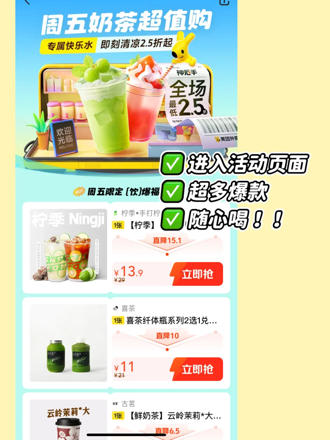 📝姐妹们快来抄作业!!打开美团/外卖APP,🔍【周五奶茶日】直接跳转到页面!不用算满减、不用蹲直播,像被奶茶搭子提前备好了惊喜,主打一个随心喝的快乐!