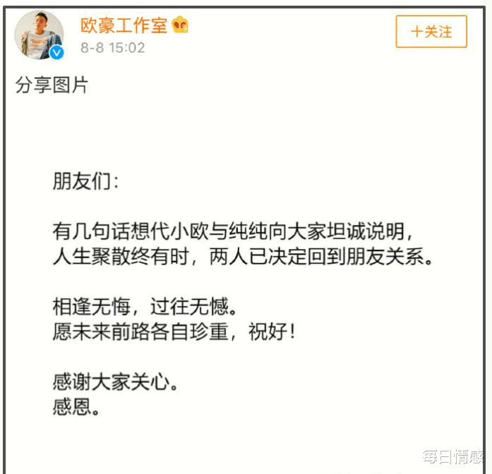 2018年8月,欧豪工作室宣称分手,马思纯工作室也宣称分手,这般持续数年的甜蜜恋情就此结束 。分手后,马思纯开始新感情生活,自分手二人便再无交集 。在这届微博视界大会上,两人带着新作登台,作为青年演员被安排坐在同一排 。