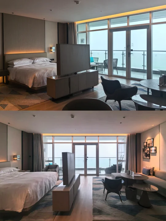 第二次是最近开船节过来,升级到了5楼70平的海景开放式套房。房间布局很不错,中间巧妙运用电视作为隔断,显的整体空间都很大。海景绝佳,适合发呆。