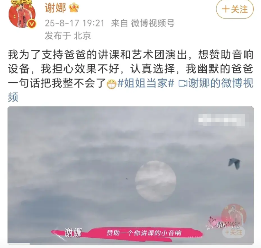 谢娜妈妈性格像小公主,爸爸好幽默! 8月17日,谢娜在社交平台连续晒出多条视频,在《姐姐当家》节目里,家人坐在一起聊天,谢妈妈被宠成小公主。 谢娜发文表示:“…因为我的妈妈,是家里爷爷婆婆哥哥弟弟最宠爱的女儿…我们整个大家庭的家风就是女儿一定要被宠爱着长大 …” 在聊天中,旁边的亲戚说谢爸爸和谢妈妈 平时在小区里走路都是手牵手。真的是一整个大家都宠着谢妈妈,这大概也是娜娜性格不错的重要原因吧。 谢爸爸的幽默真的是在随时可以体现。谢娜为了支持爸爸的讲课和艺术团演出,想赞助音响设备。在选设备时,娜娜说要选效果好的。爸爸一句:“你不要跟张杰那个音响比…”把在场的和不在场的都逗笑了。嘉宾席上的李维嘉笑言:“鸟巢演唱会”… 娜娜发文:“…我幽默的爸爸一句话把我整不会了” 真的是好幸福的一家人呀。