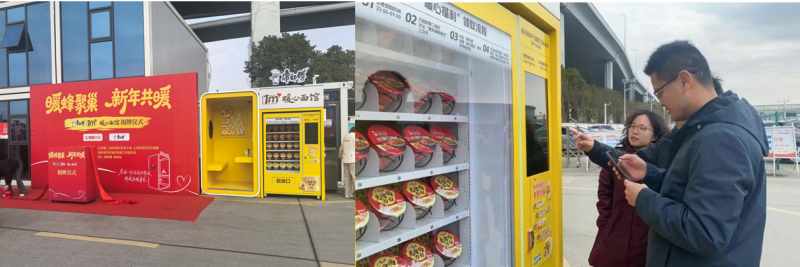 室外广场上,康师傅“1㎡暖心面馆”正式揭牌。黄色的面馆形似车厢,温馨明快,饮水机、餐巾纸一应俱全。晚上十点到次日早上九点,网约车司机可以免费领一碗老母鸡汤面或红烧牛肉面。后台会根据数据实时补货,确保深夜也不断供。