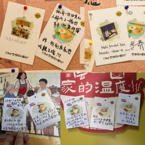 在这里,吃完面的旅客常常会走向互动区,提笔写下自己的心声。“好好吃饭,好好生活”、“希望爸妈身体健康”、“新的一年,少些焦虑”……这些简单真挚的愿望被挂在墙上,形成一片温暖的心愿墙。打卡区那些“当团聚不再那么轻而易举,我们才明白‘家’的意义”等话语,精准触动了游子们心中最柔软的部分。