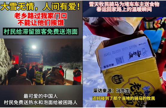 这已经不是第一次在春运途中感受康师傅的温暖了,2024年春节期间,湖南等地遭遇冻雨天气,多条高速公路严重拥堵,归家的人们被困于途中。附近的村民得知情况后给滞留的司机和乘客送上免费的泡面和热水,康师傅的物资车也开到了高速上给大家免费送面。前两天更是有网友晒出雪天回家堵车,牧民亲切的为车主送上康师傅老母鸡汤面。这些温暖的瞬间也在告诉我们,无论时代如何演变,不变的是旅途中温暖陪伴的康师傅。