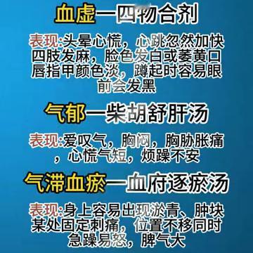 气血才是人间大药。 ·气虚一:君子颗粒。表现:整天感到累,乏力不想动,精神疲惫蹲起时容易天旋地转,头军,容易出虚汗、生病感冒,抵抗力差。 ·血虚一:四物合剂。表现:头晕心慌,心跳忽然加快,四肢发麻,脸色发白或萎黄,口唇指甲颜色淡,蹲起时容易眼前会发黑。 ·气郁一:柴胡舒肝汤。表现:爱叹气,胸闷,胸胁胀痛,心慌气短,烦躁不安。 ·气滞血瘀一:血府逐瘀汤。表现:身上容易出现淤青、肿块,某处固定刺痛,位置不移同时急躁易怒,脾气大。