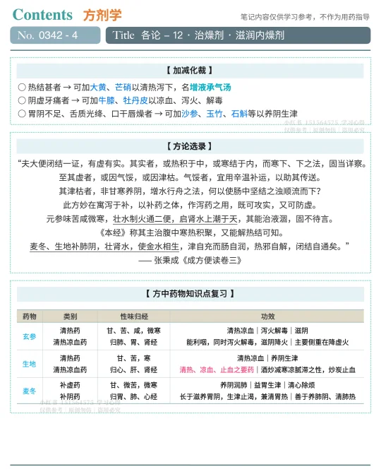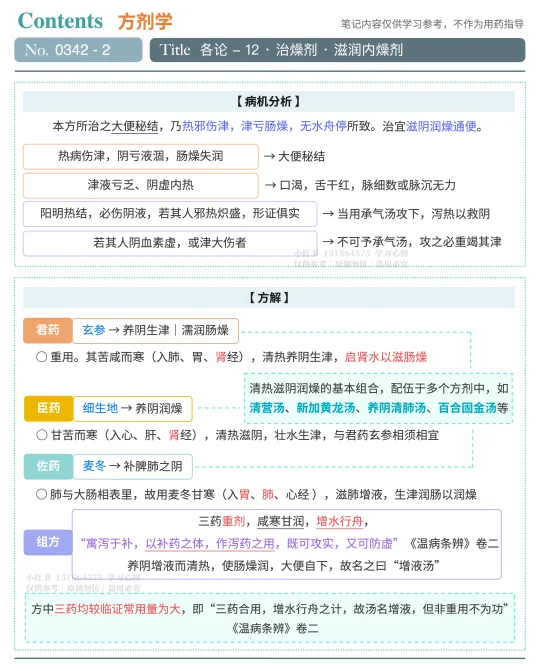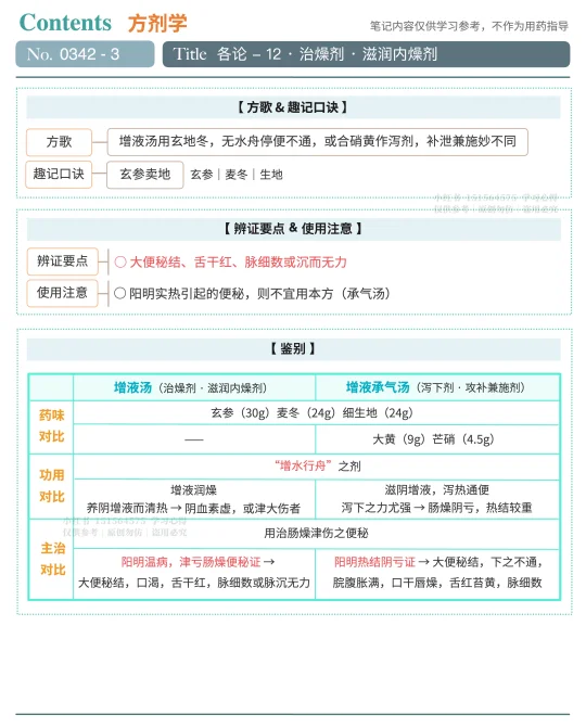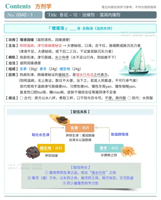 书摘 🍀🍀🍀 增液汤《温病条辨》🍀🍀🍀 【 功用 】增液润燥(滋阴清热,润燥tong便) 【 主治 】阳明温病,津亏肠燥便秘证 → 大便秘结,口渴,舌干红,脉细数或脉沉无力 【 病机 】热邪伤津,津亏肠燥,水少舟停(水不足以行舟,而结粪不下) 【 治法 】滋阴润燥tong便 【 应用 】热病伤津、肠燥便mi证的基础方,也是增水行舟法的代表方。现代常用于温病津亏肠燥便mi、习惯性便mi、慢性牙周yan、慢性咽喉yan、复发性口腔kui疡、糖niao病、皮肤干燥综合征等属阴津不足者 【 君药 】玄参(30g) 【 臣药 】生地(24g) 【 佐药 】麦冬(24g) 【 特点 】以补药之体,做泻药之用;重用养阴生津之品,“增水行舟”;药少量重而效专力宏 【 方歌 】增液汤用玄地冬,无水舟停便不通,或合硝黄作泻剂,补泄兼施妙不同 【 趣味记忆 】玄参卖地 【 辨证要点 】大便秘结、舌干红、脉细数或沉而无力 【 使用注意 】阳明实热引起的便秘,则不宜用本方(应该用承气汤) 🔖🔖🔖 鉴别 🔖🔖🔖 【 增液汤 】🆚【 增液承气汤 】都是“增水行舟”之剂 → 治肠燥津伤之便mi 1. 药味对比 * 增液汤 → 玄参(30g)麦冬(24g)细生地(24g) * 增液承气汤 → 增液汤+大黄(9g)芒硝(4.5g) 2. 功用对比 * 增液汤 →养阴增液而清热(阴血素虚,或津大伤) * 增液承气汤 → 滋阴增液,且泻下之力强(肠燥阴亏,热结较重) 🪴🪴🪴名句摘录🪴🪴🪴 “三药合用,增水行舟之计,故汤名增液,但非重用不为功”《温病条辨》卷二 “寓泻于补,以补药之体,作泻药之用,既可攻实,又可防虚”《温病条辨》卷二