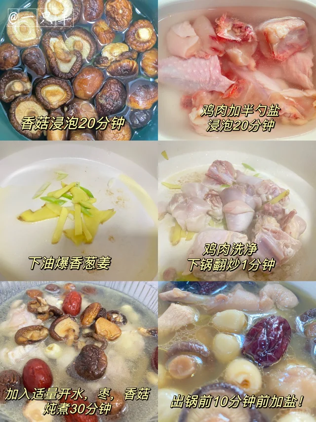 1️⃣香菇浸泡20分钟,鸡肉加半勺盐适量水,浸泡出血水后洗净