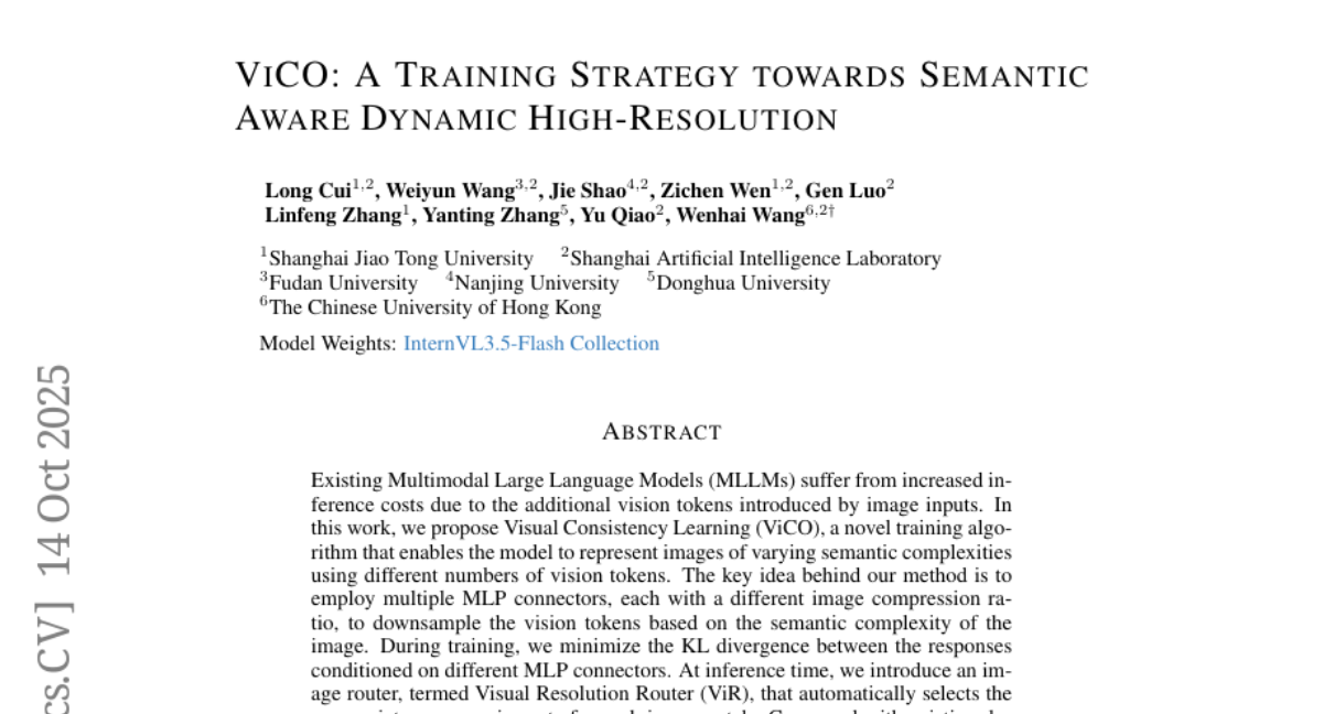 这项由上海人工智能实验室联合上海交通大学、复旦大学、南京大学、东华大学和香港中文大学共同完成的研究,发表于2025年10月的arXiv预印本平台(编号:arXiv:2510.12793v1)。对于关注AI发展的读者,这项名为"ViCO:面向语义感知动态高分辨率的训练策略"的研究带来了令人振奋的突破。
