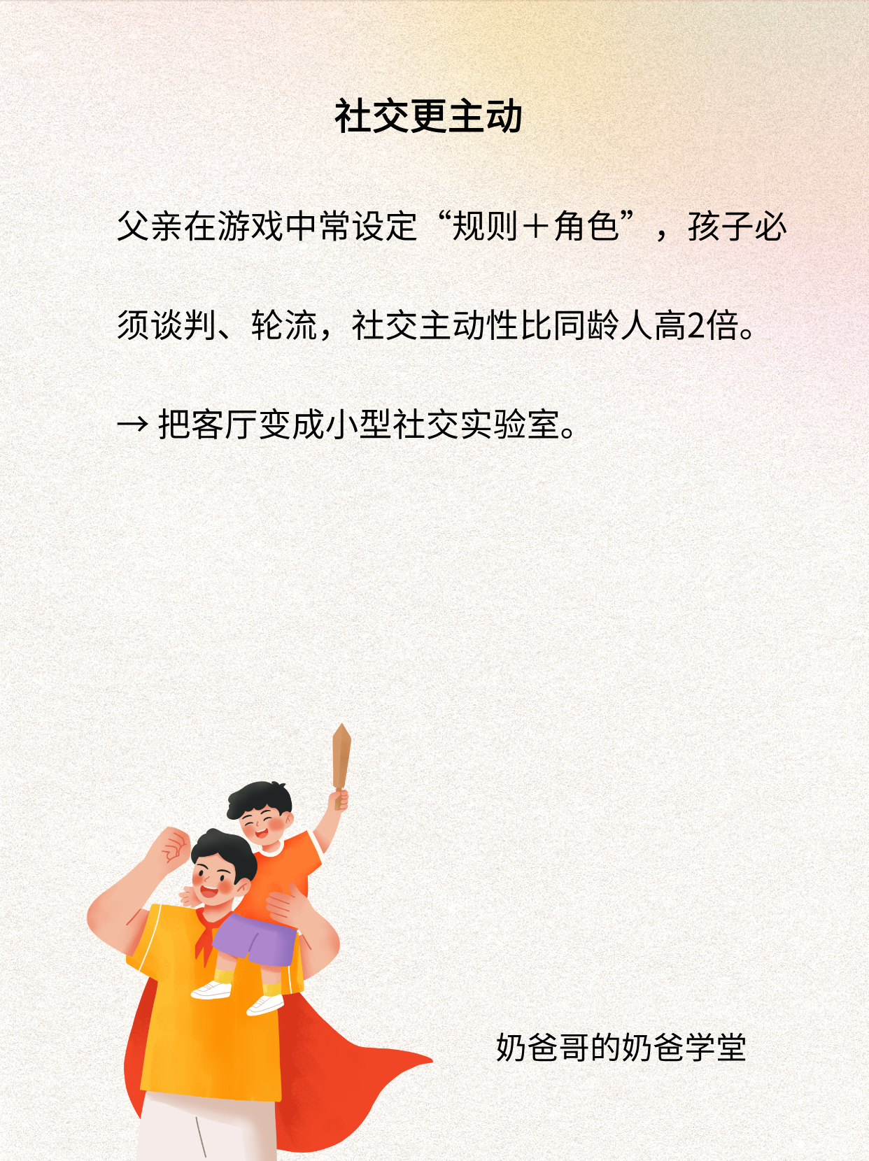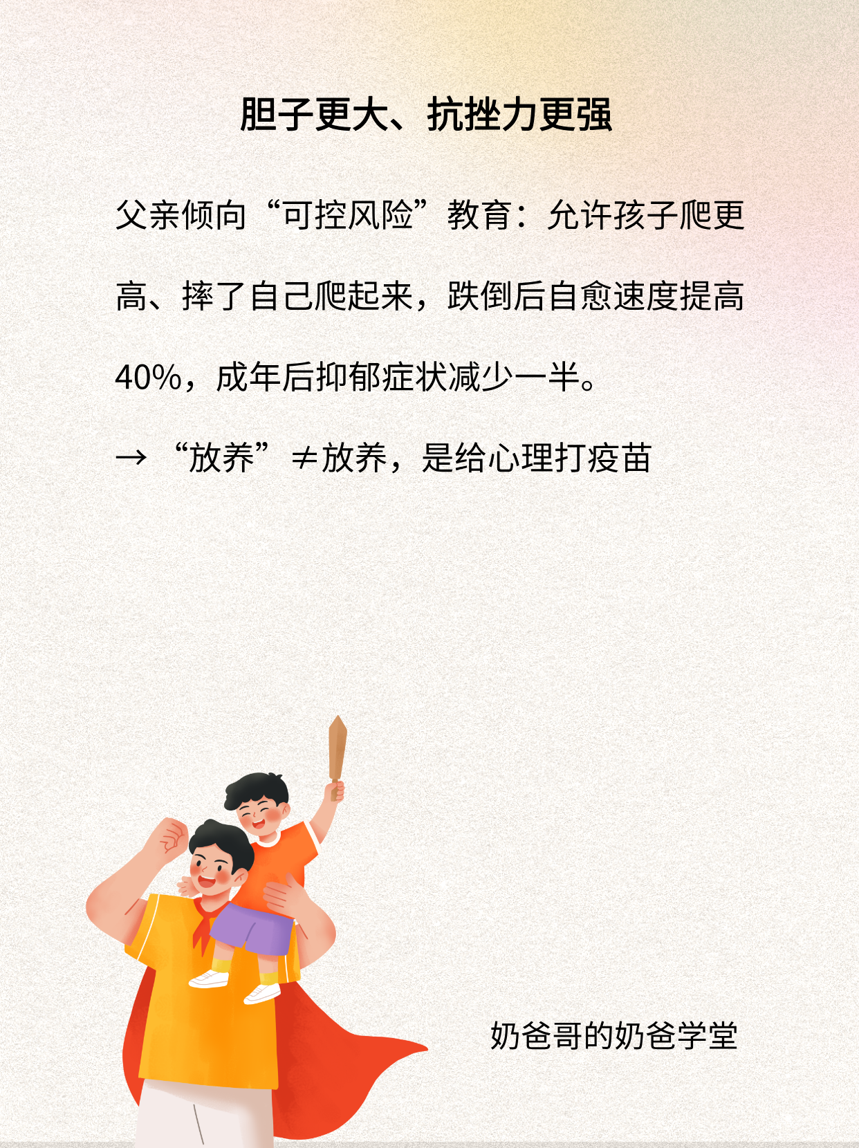 给妈妈的温馨提示 别嫌爸爸把衣服穿反、头发没梳,那是孩子“独立勋章”。 爸爸带娃有很多的好处,而且很多好处是妈妈带娃无法替代的, 当妈妈理解了爸爸带娃的好处,安心把娃甩给爸爸, 那孩子就有福了。