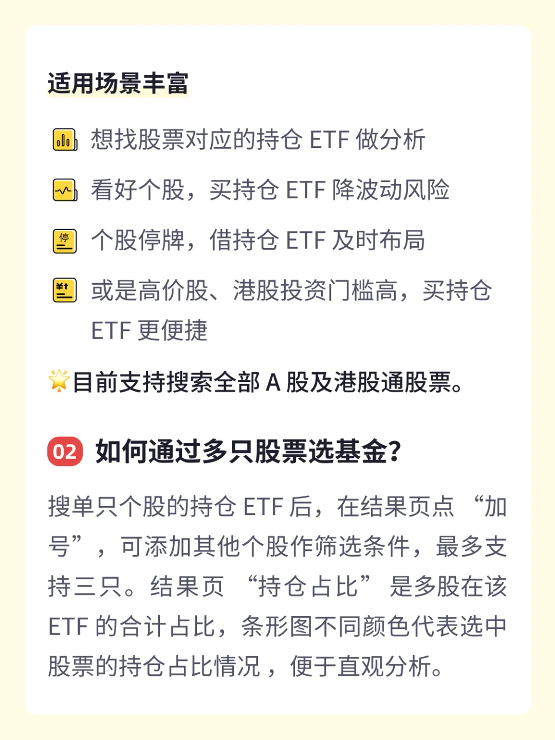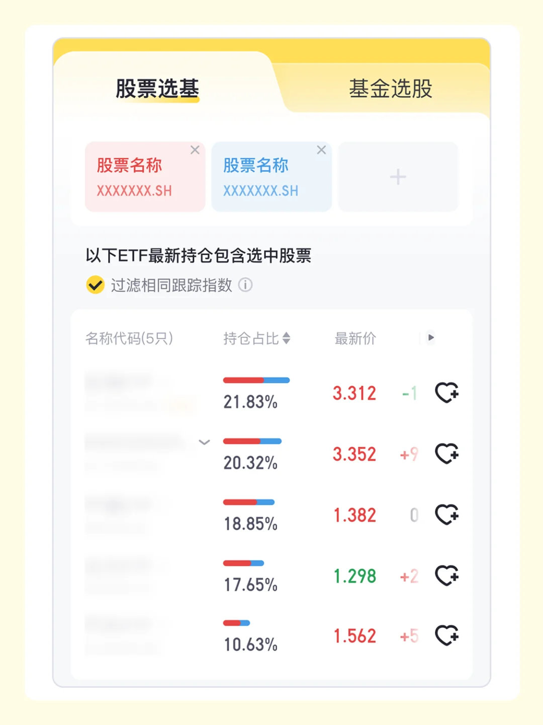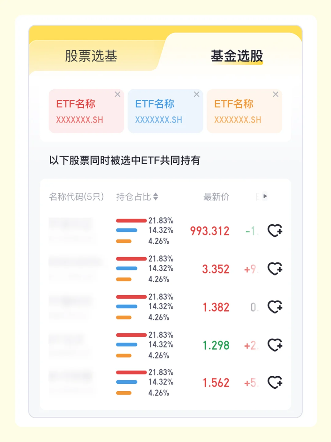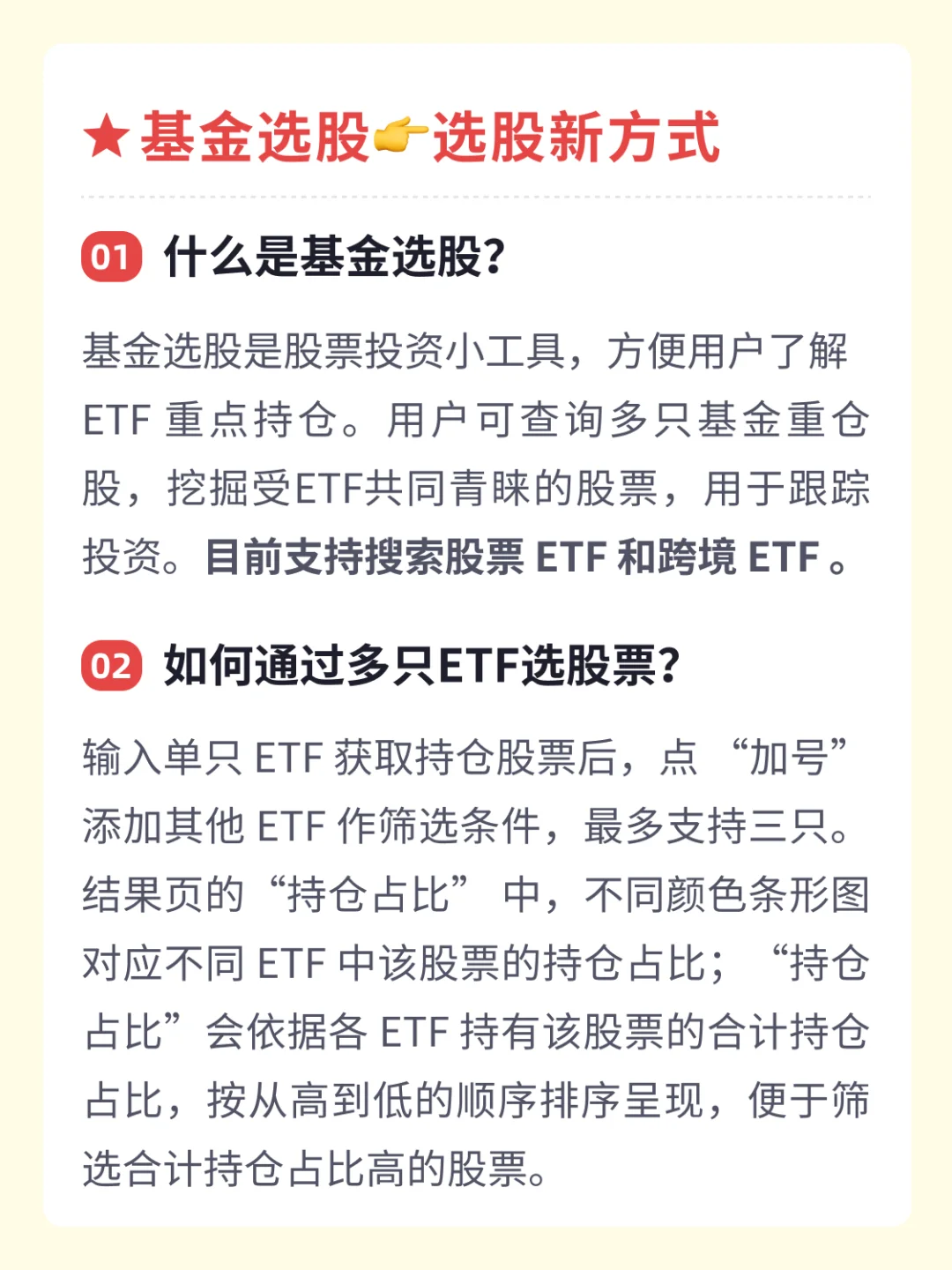 基金选股是股票投资小工具,方便用户了解 ETF 重点持仓。用户可查询多只基金重仓股,挖掘受ETF共同青睐的股票,用于跟踪投资。目前支持搜索股票 ETF 和跨境 ETF 。