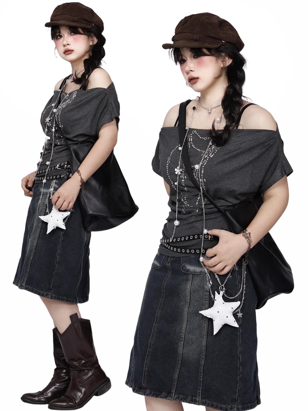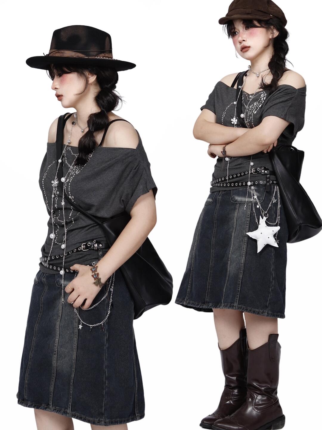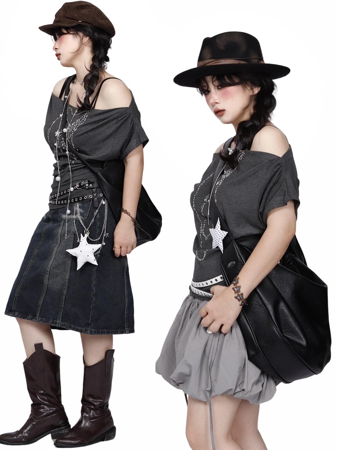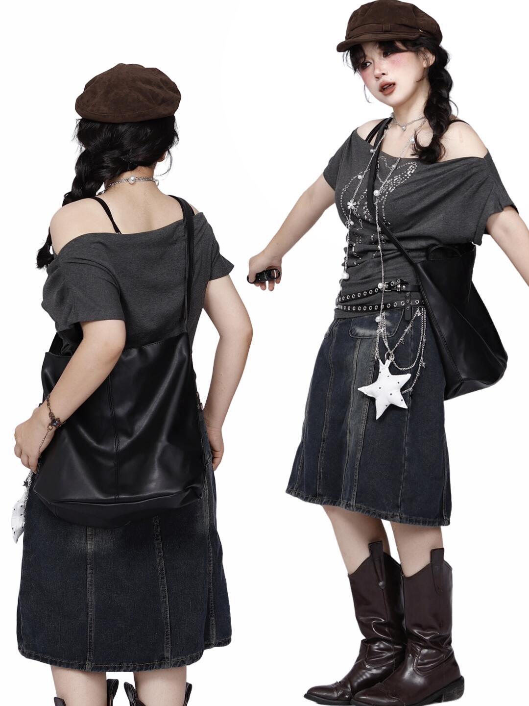 *复古斜肩上衣x牛仔半裙🖤艺术生学姐叠穿