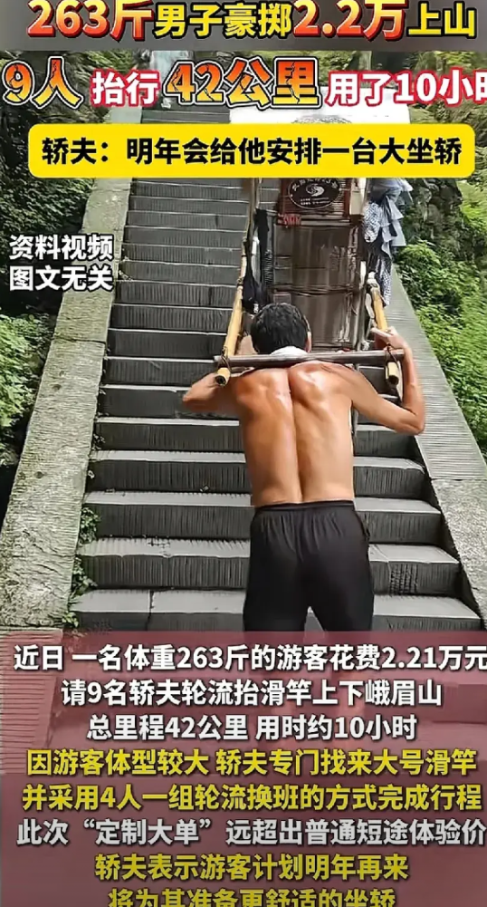 峨眉山,一名体重达263斤的男子花费2.21万元坐滑竿上山。 九位轿夫轮流抬着他,往返路程达42公里,耗时十个小时才将男子抬到山顶,而后又抬下山。