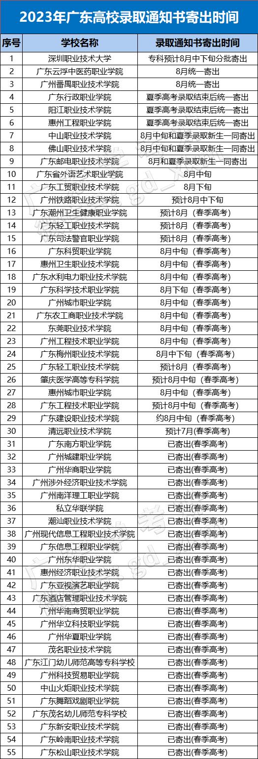 给大家汇总了2023年广东省内专/本科高校录取通知书的寄出时间!快来看看什么时候才能收到你的录取通知书吧👇👇👇 (注:以上寄送时间综合整理自各校官微、网络,仅供参考。部分高校录取通知书可能已寄出,但并未在官微、官网明确具体发放时间,请同学们自行留意通知书寄送物流信息)