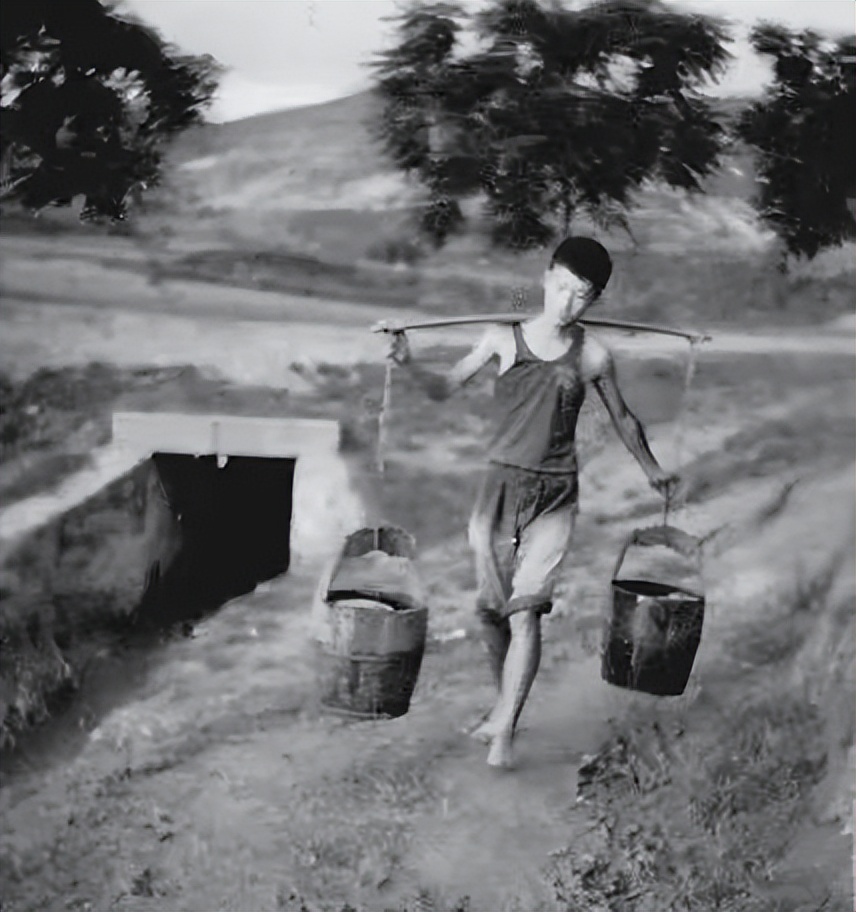 农家的水桶,通常是为成年人所备,一担装满水的水桶,重量在七八十斤左右,这非十来岁孩子们所能承受的重量,于是,家中兄弟姊妹,两人一组抬着一只水桶去提水抬水回家,小小年纪,稚嫩的肩膀,通过共同合力协作,分担家庭家务的重担。