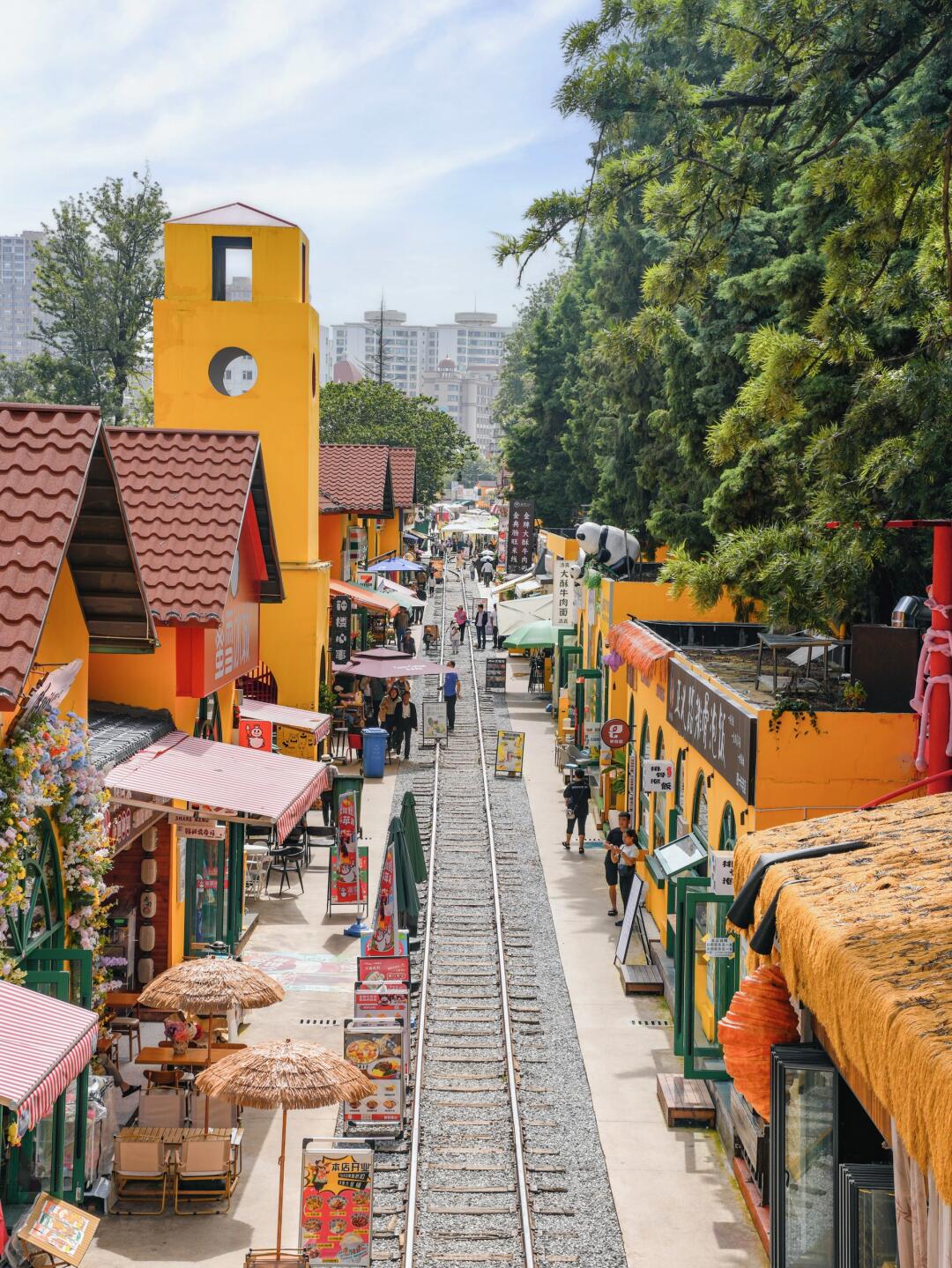 滇越铁路麻园站,修建于抗战初期,公园保留了复古的黄墻绿窗充满法式风情,晚上的轨道市集很是热闹