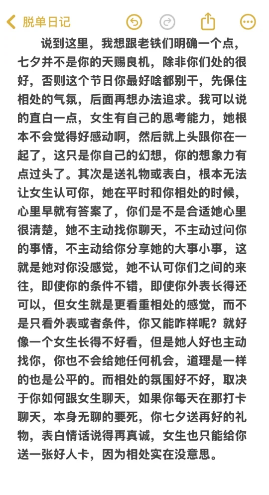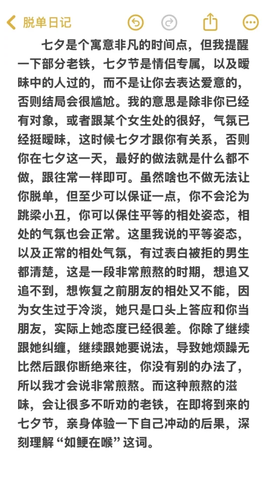 全网都在教你怎么规划七夕、怎么提出邀请、怎么挑选约会项目、怎么挑选时间地点、怎么穿着打扮的时候,只有我在劝你冷静,只有我在给你泼冷水。我为啥要这样煞风景?因为这些事情我早些年都做过了,基本都以尴尬作为收场,我也听到过很多朋友给我分享类似的遭遇,确实很煎熬而且遗憾,只有经历过的人才会懂。还没做过的朋友会可能质疑我的观点,但是没关系,等到七夕到来后,结果大概率会证明我是对的。