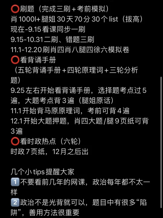 回顾我的考研生活,前期一整个浑浑噩噩,一转眼就到八月中旬了。如果你才开始学政治或者学到现在还不知道咋学政治,那么可以参考我上面的强度和规划。几个小tips提醒大家