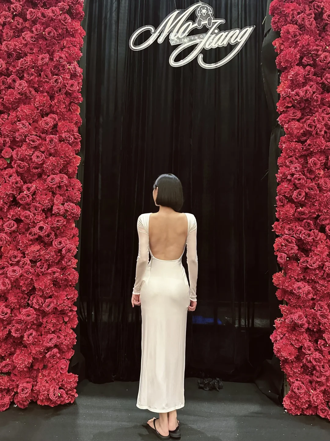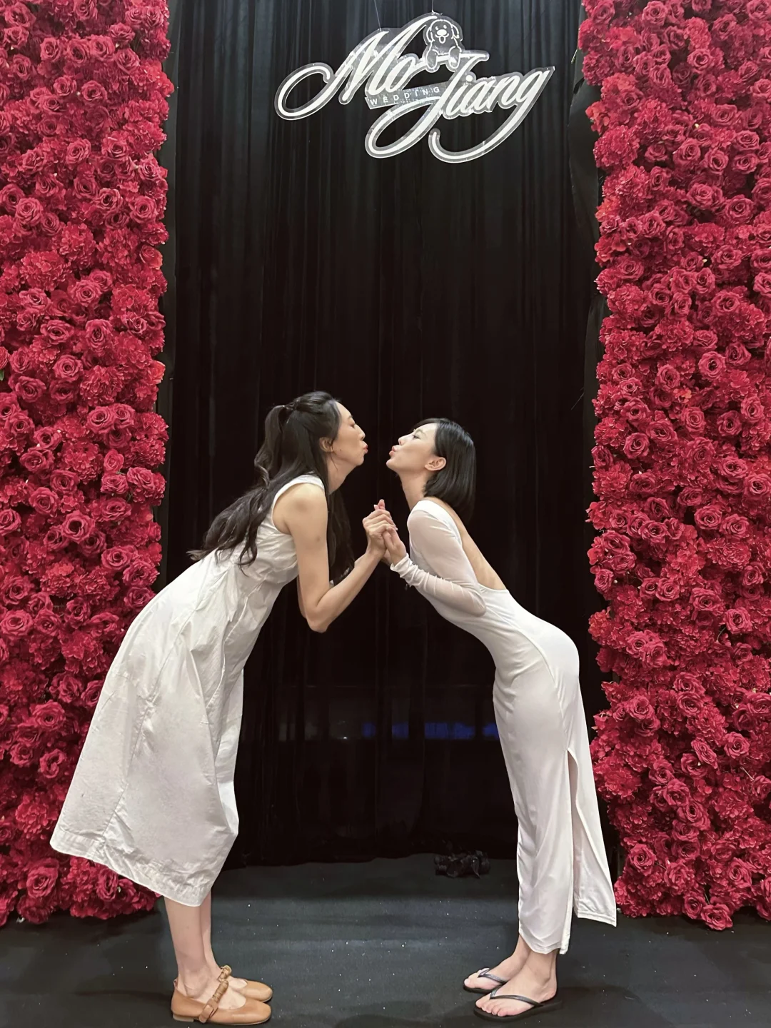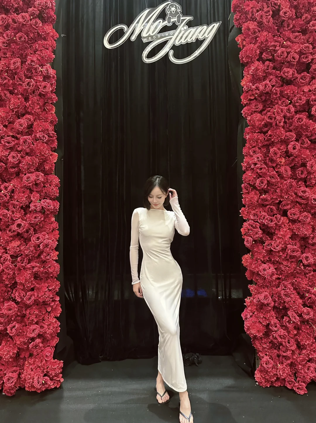 站一天太累啦,换上人字拖来闺蜜婚礼的背景墙拍拍照 白色连衣裙高级优雅,简单大方也不抢风头