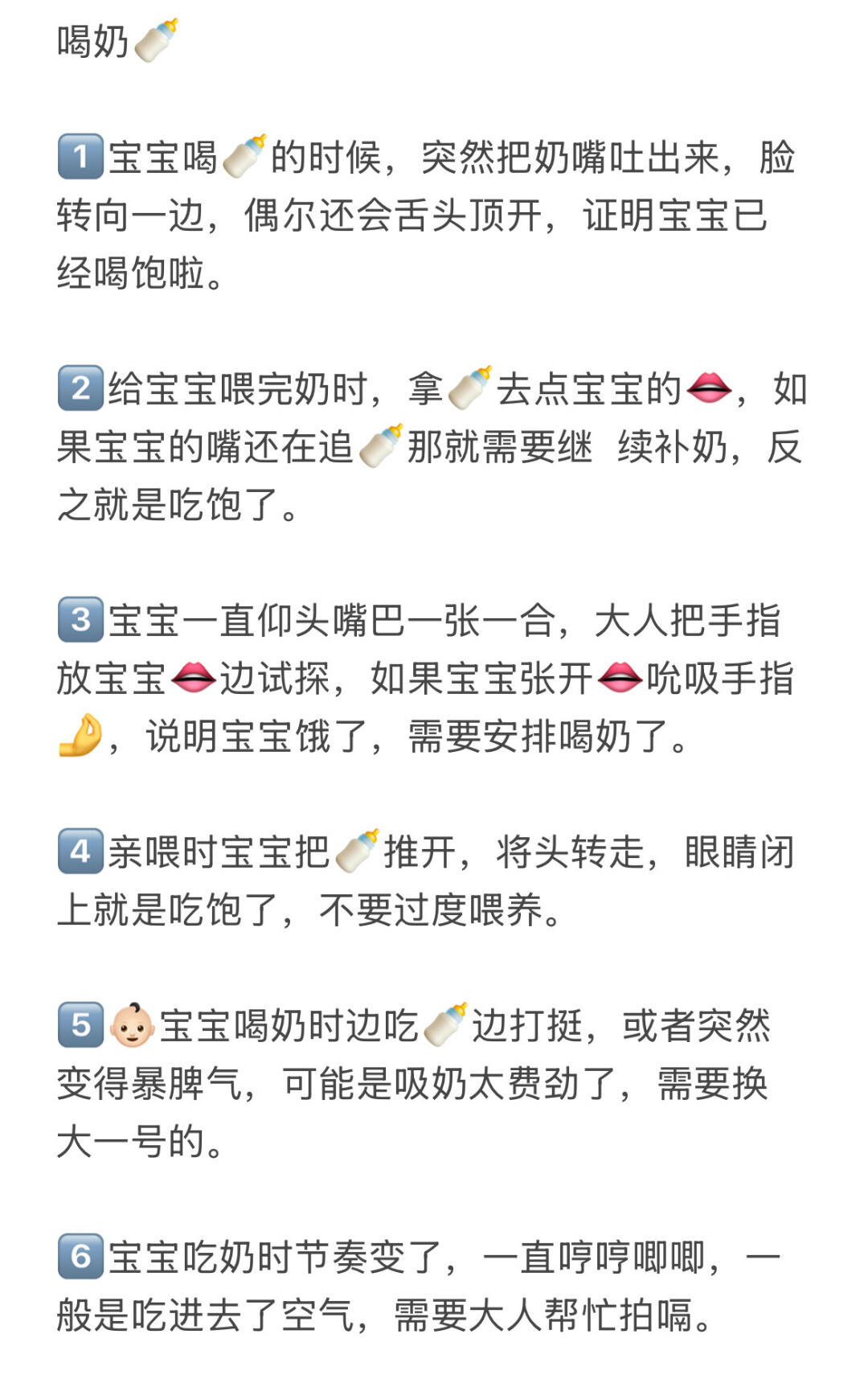 1⃣️宝宝喝🍼的时候,突然把奶嘴吐出来,脸转向一边,偶尔还会舌头顶开,证明宝宝已经喝饱啦。