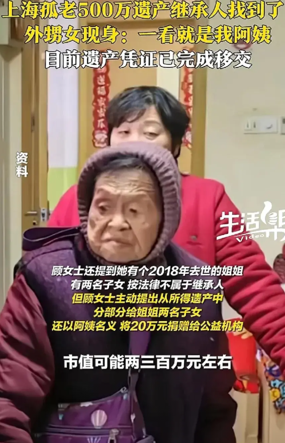 上海,90岁顾阿婆500万遗产的继承人已经找到,顾阿婆的外甥女顺利得到了一套价值300万的房子,还有200万的存款。