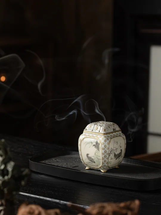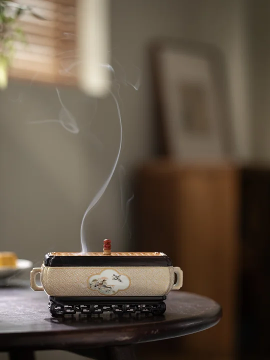 满工描金的宋锦纹铺底,粉彩开窗绘就春秋景致,炉盖大胆运用紫光檀作外框、黄杨木雕镂空版面,双木相拼冷暖呼应,烟线自木纹孔窍垂落,似将窗外四季凝作一缕悠长的时光细流。