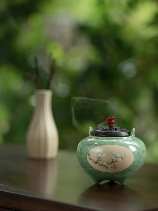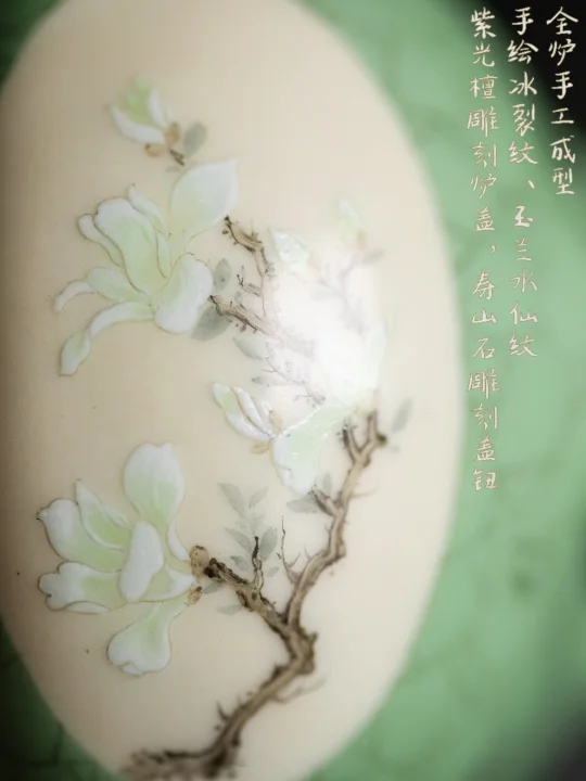 釉上彩绘水仙玉兰倚窗而立,裂纹底纹暗喻百岁吉祥,烟萦回升起,恰似花香透窗而出,清雅君子之气随烟流转,沁人心脾。