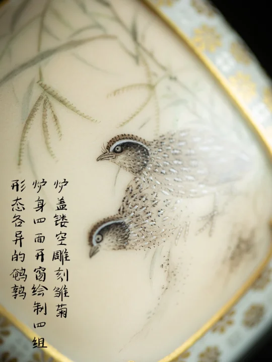 错金银工艺勾勒出雏菊镂空盖,炉身四面开窗,鹌鹑嬉戏于窗内,羽翼翩跹如生,烟从菊瓣间穿过,仿佛为鸟雀披上一层轻纱,安居乐业的暖意随烟弥漫。
