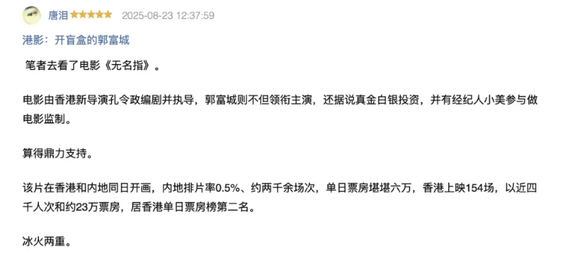 当然了郭吹们会继续转换角度扯《无名指》是低成本低片酬,郭富城是为了试错开盲盒......