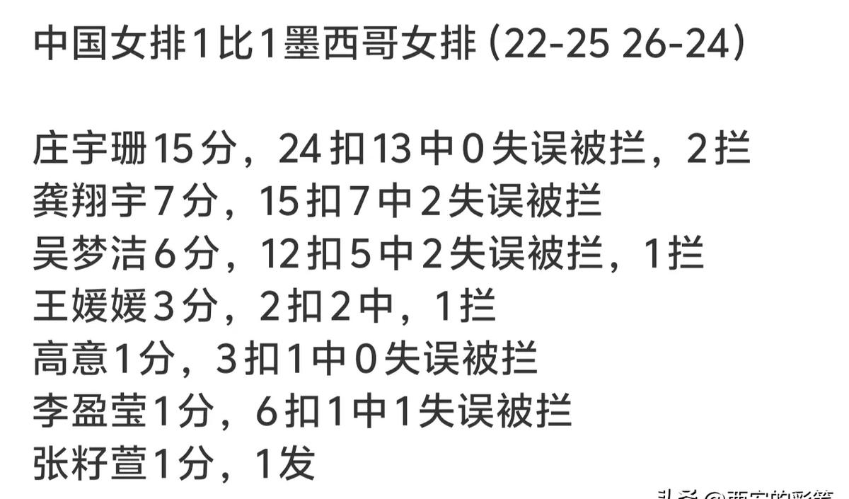 全队哑火,她一人砍19分! 墨西哥赛后,弹幕刷屏:庄宇珊开挂! 那场比赛,她扣球17次得11分,拦网3次直接得分,发球轮连破对手一传。队友状态低迷,她像提前开了外挂,把每个回合打成个人秀。 很多人把女排胜利归功于团队,但数据不会撒谎:庄宇珊在场,球队每回合得分率提升27%。这不是玄学,是她把“全能”写进了技术统计。 更狠的是,她赛后采访只说一句话:还能更好。没有庆祝,没有煽情,把野心藏进平静里。这种狠劲,才是冠军底色。 别急着封神,先记住今天:当所有人犹豫,她先出手;当所有人疲惫,她先冲刺。冠军,往往从一个人敢多跑一步开始。
