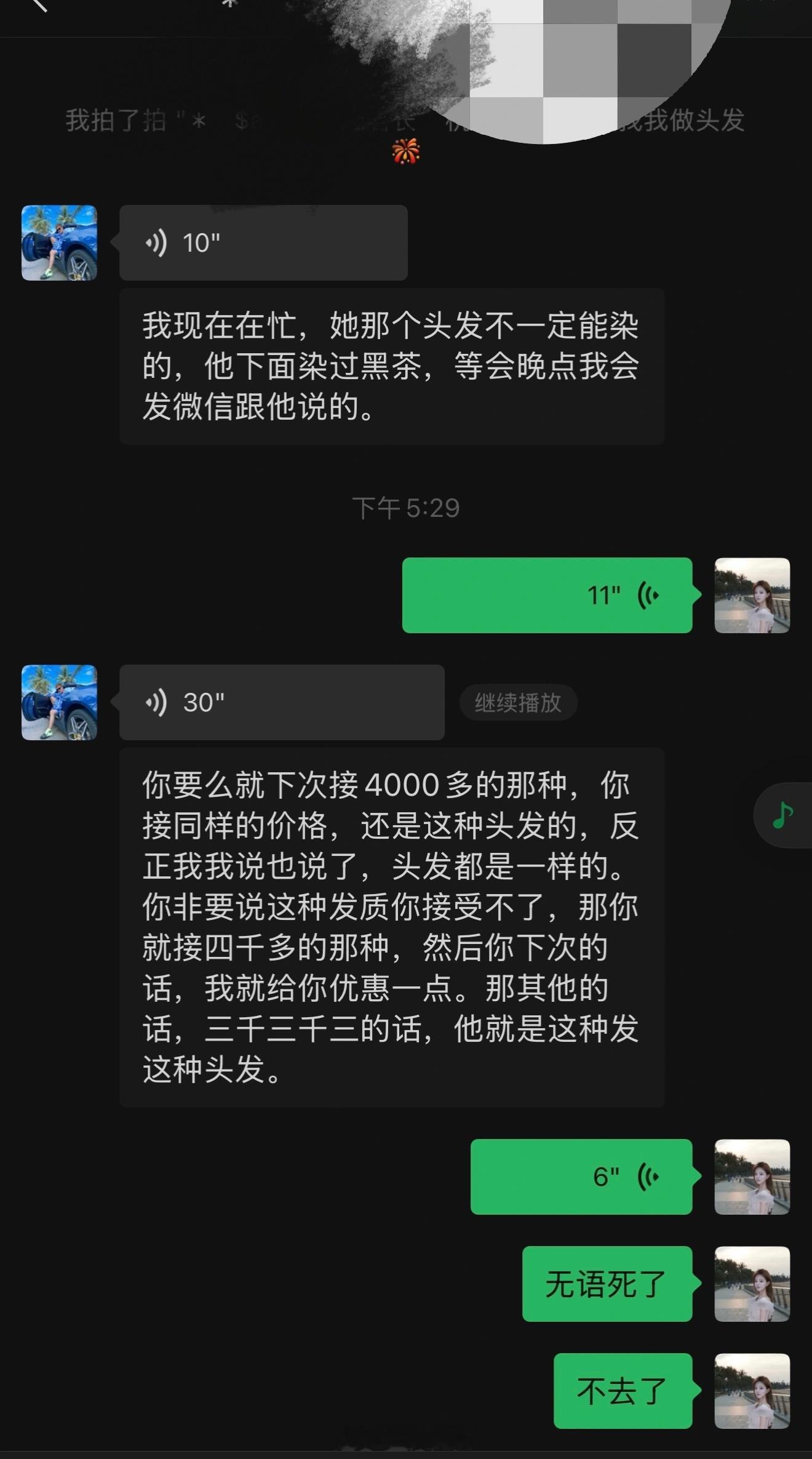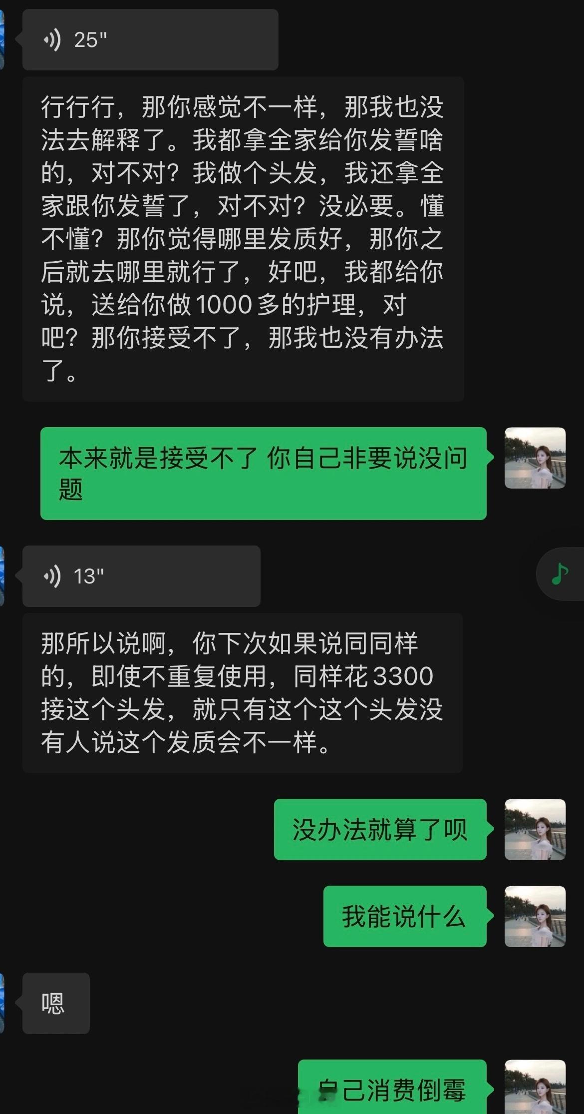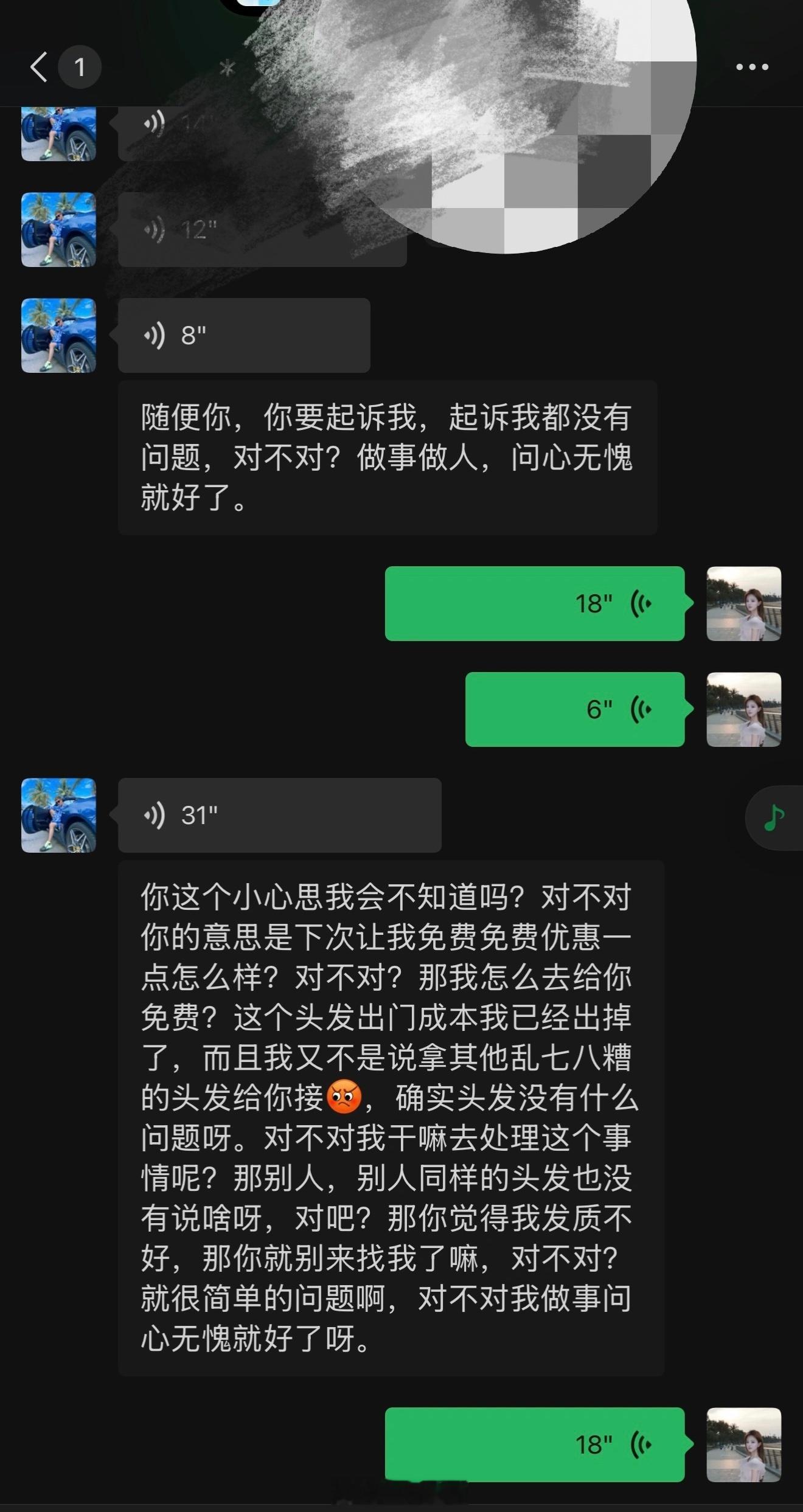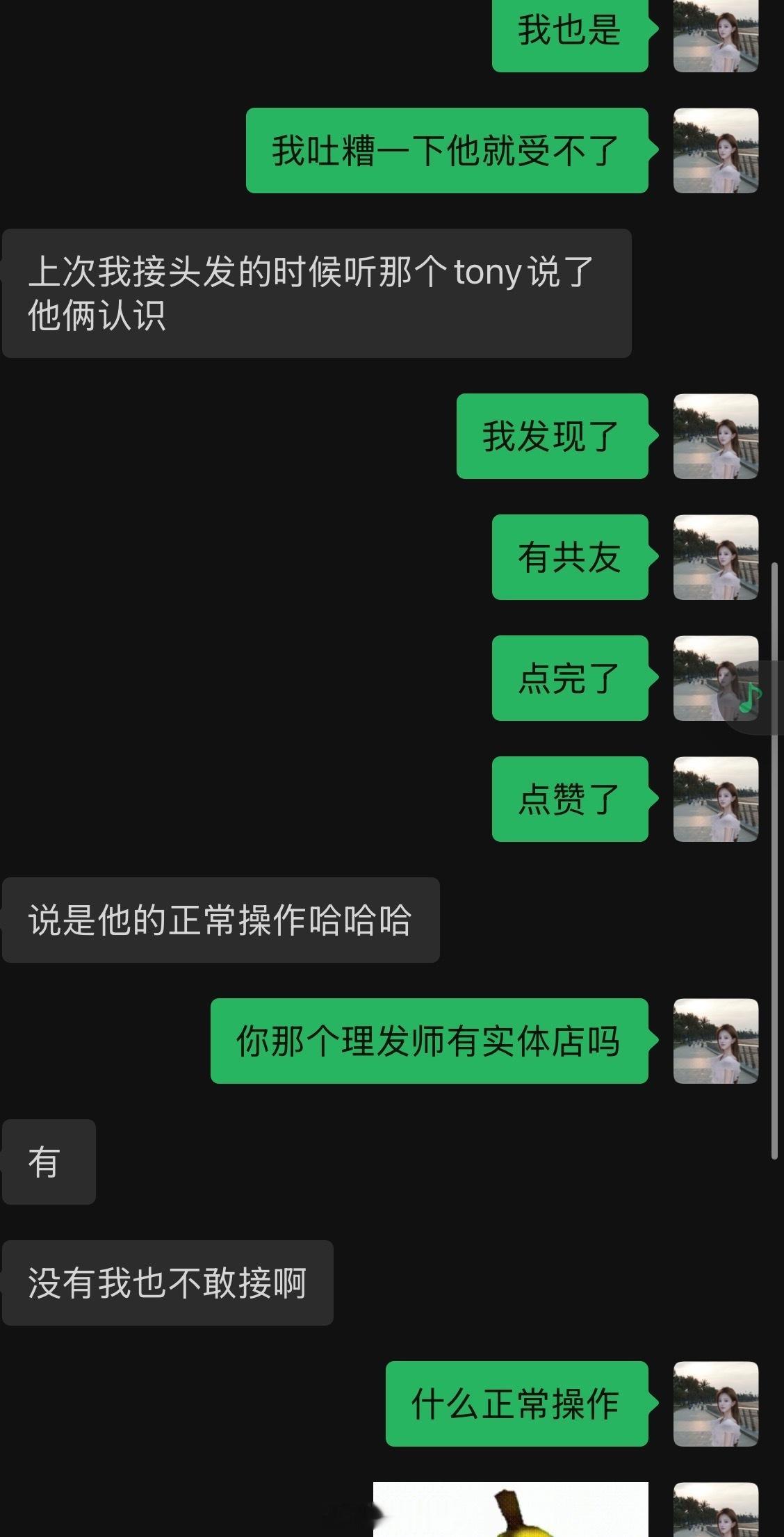 这个🍠子涵的理发师,第一次接头发感觉发质还行,所以第二次又来接了,但是第二次接了以后感觉发质不好,于是我要求处理一下,重新接,他说只能做护理,说接不了发质没问题。那我于是就算了,发了朋友圈吐糟,他就说我想白嫖他接头发,并且出言骂客户。