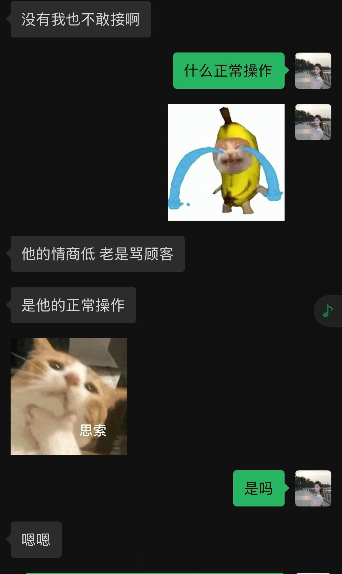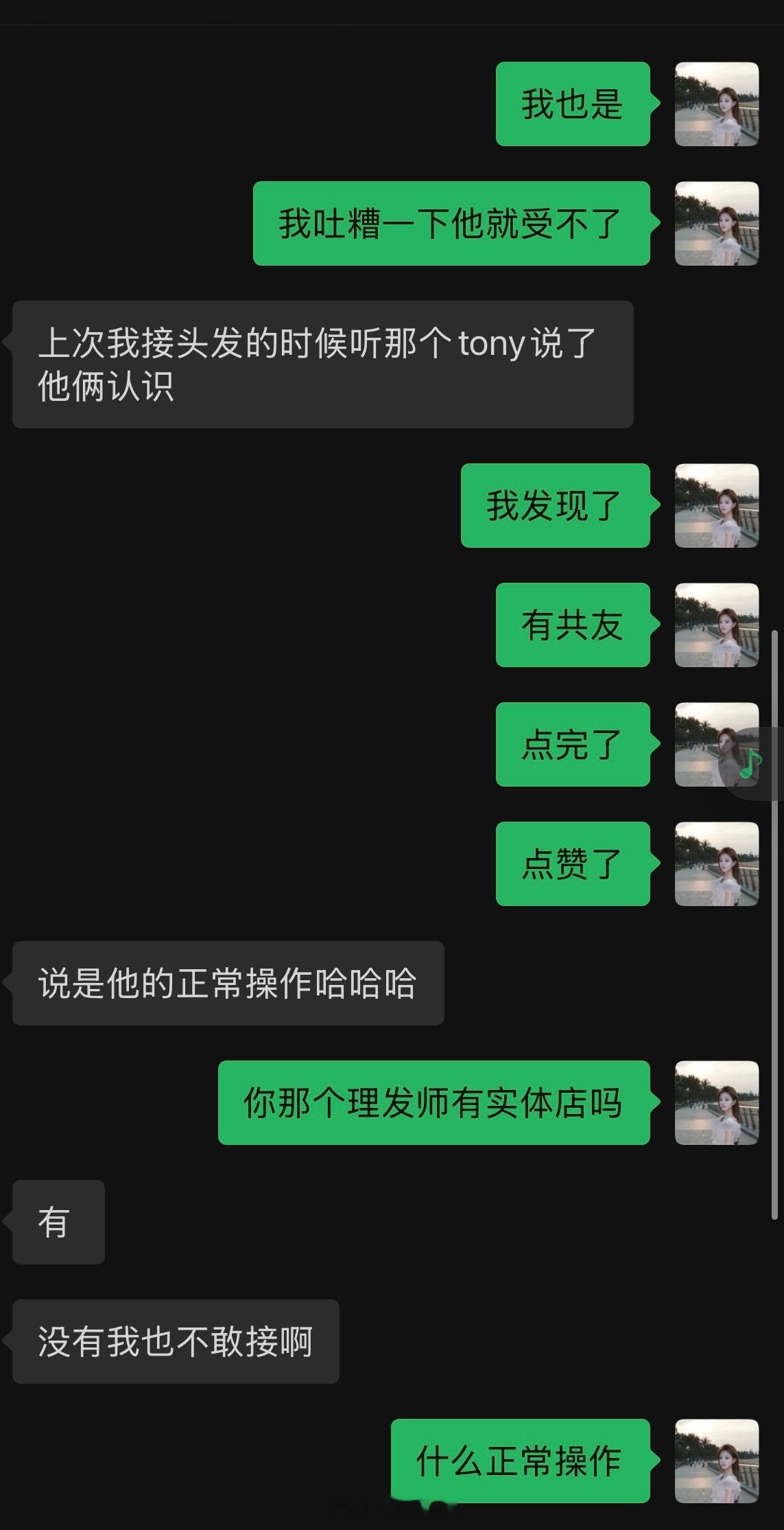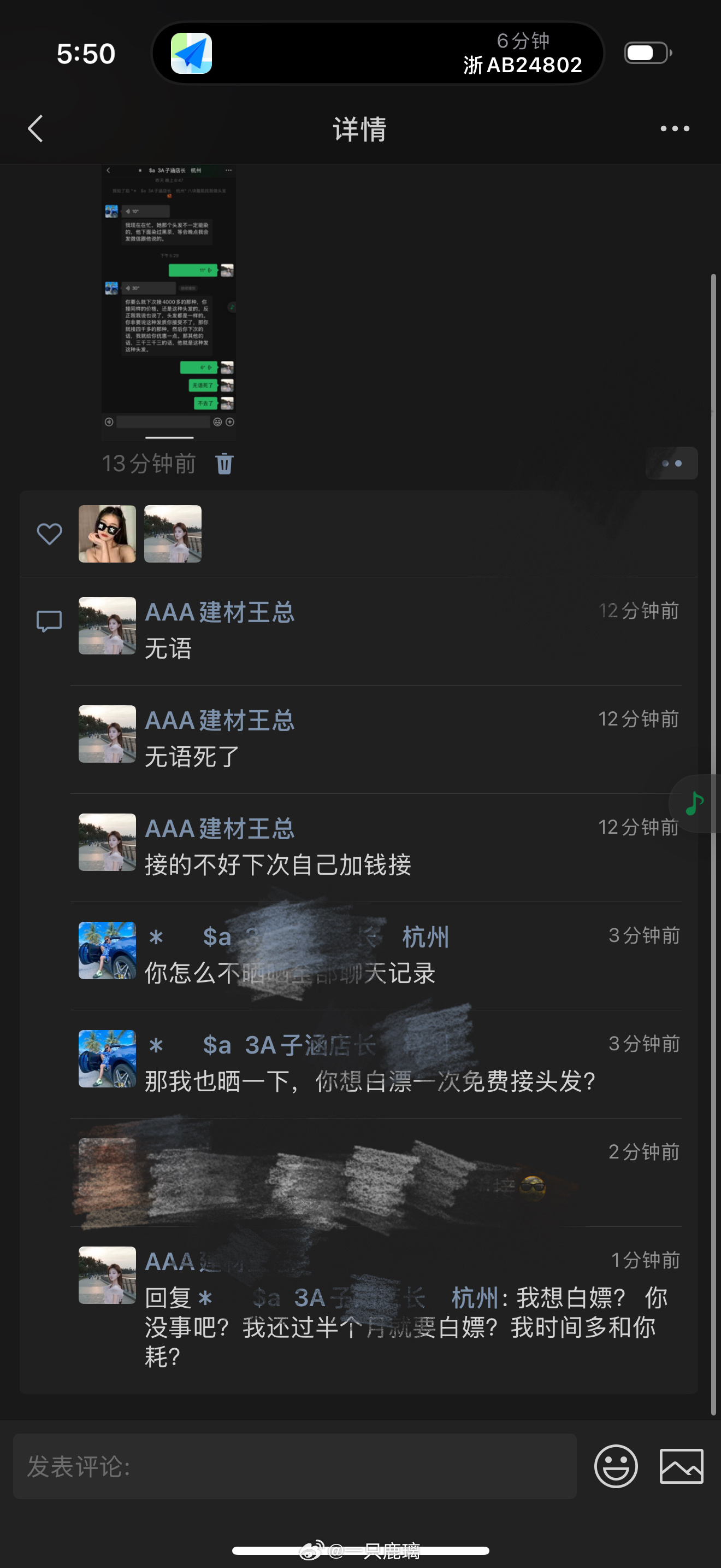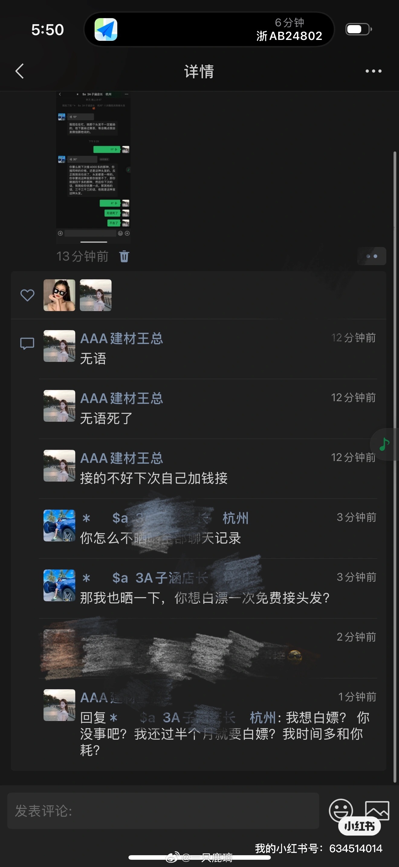 这个🍠子涵的理发师,第一次接头发感觉发质还行,所以第二次又来接了,但是第二次接了以后感觉发质不好,于是我要求处理一下,重新接,他说只能做护理,说接不了发质没问题。那我于是就算了,发了朋友圈吐糟,他就说我想白嫖他接头发,并且出言骂客户。