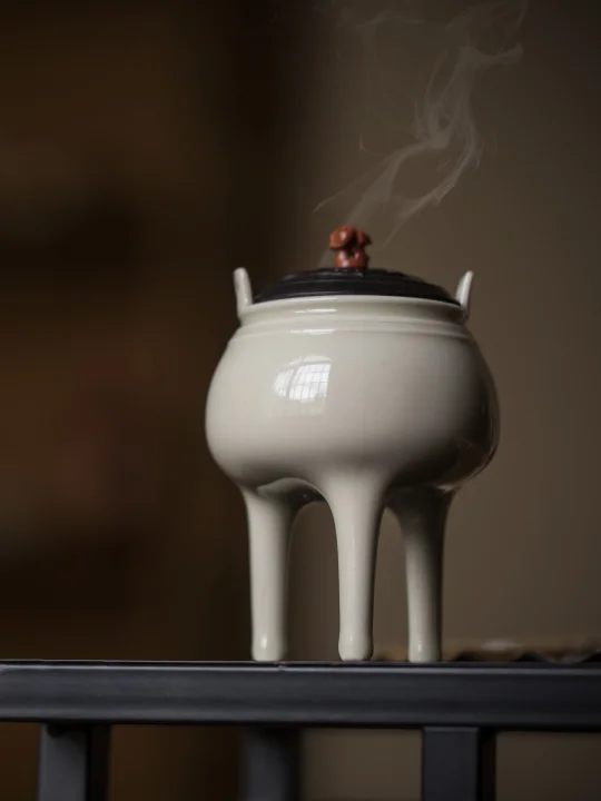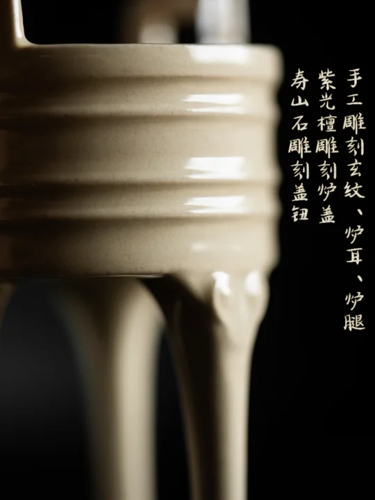 釉面似雨后远山般氤氲朦胧,炉身形制挺拔如松,朴拙中见精巧,是明式铜炉的瓷上转译。