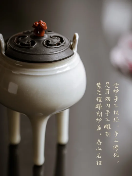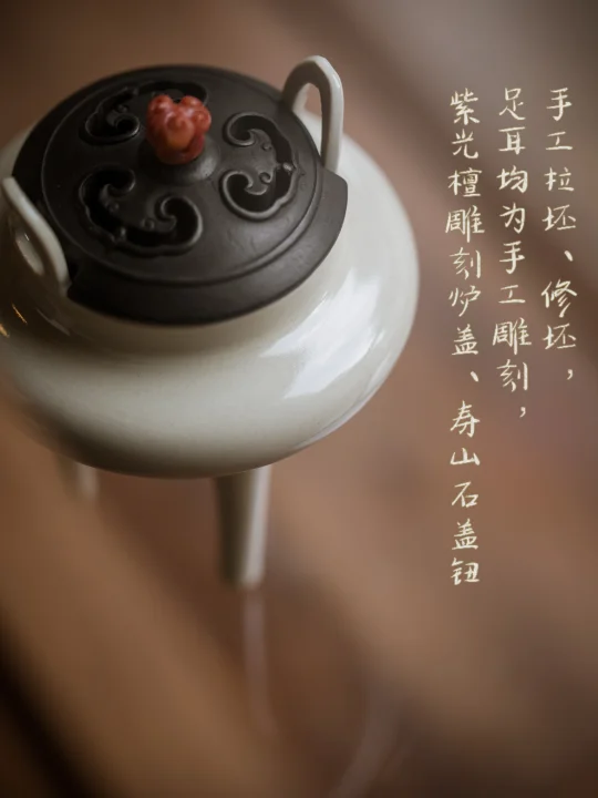 手工拉坯修出的胎骨含蓄饱满,足耳雕刻如书法运笔的顿挫,紫光檀盖与寿山石钮轻合,支烧工艺令足底裹釉,连触碰桌面的刹那都温柔无声。