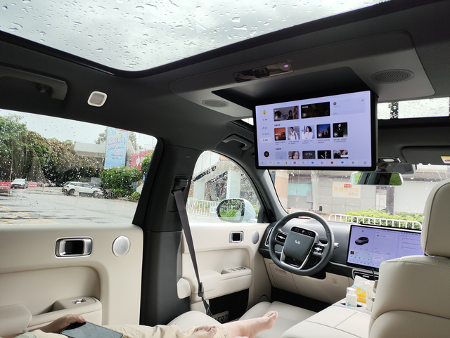 首先我先说这部车的空间真的是无敌的大,对比过很多,除了极氪001车身尺寸差不多之外,其它同级别是最大的。里面的电视,冰箱,大沙发还有音响真的把我老婆拿捏了,坐在二排看全景声杜比音电影就跟电影院一样非常震撼!直接就是颠覆了我对一辆车的概念原来车还可以做到这样!座椅的倾斜度刚刚好,腿搭在前排,长时间看也不会太累,太巴适了。