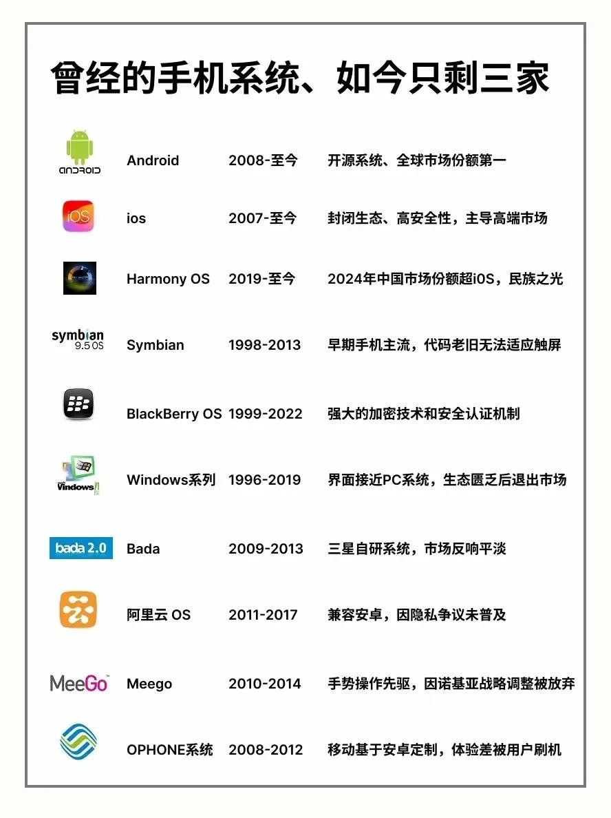 也许你没想到,手机操作系统除了安卓和苹果iOS之外,曾经还之前有10个操作系统。 最出名的当属微软黑莓两大巨头的操作系统,他们差一点就成功了,但倒在了黎明之前。 而你知道吗?中国移动和阿里巴巴也曾经推出过自己的操作系统,但确实没有惊起什么水花。 由此,我们现在知道华为独立推出“纯血鸿蒙”需要多大的勇气了,确实做一套操作系统从技术上并不是那么的遥不可及,但建立一整套的生态确实难如登天。现在鸿蒙5.0手机设备超过千万,车机以及其他Iot设备超过2亿,开发人员超过300百万,适配软件达到20000+。 这一连串的数字说明,功能真的成了,成为了全球第三发操作系统,成为可以与安卓和iOS掰手腕的存在。自此,鸿蒙成为拜托美系操作系统的唯一选择,也就是全球的第二选择。 未来会有其他国家也跟上,用鸿蒙吗?值得期待!操作系统架构 手机系统攻略 安卓桌面模式 IOS系统 操作系统重构 华为 安卓